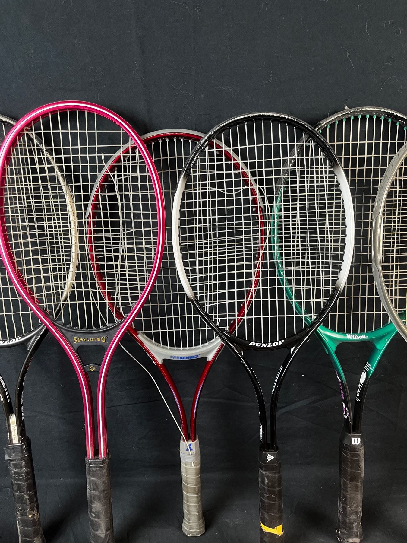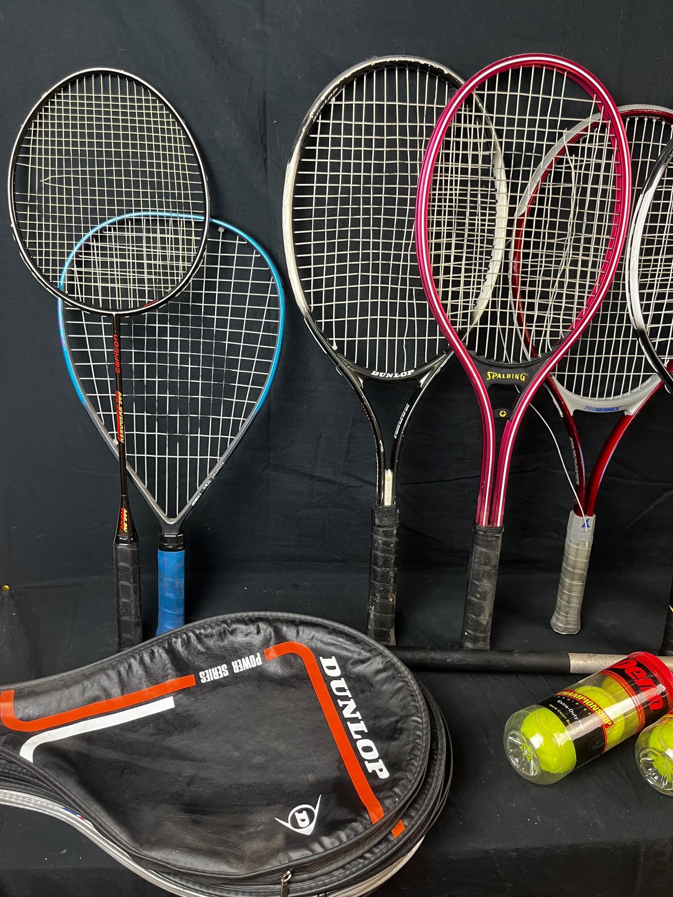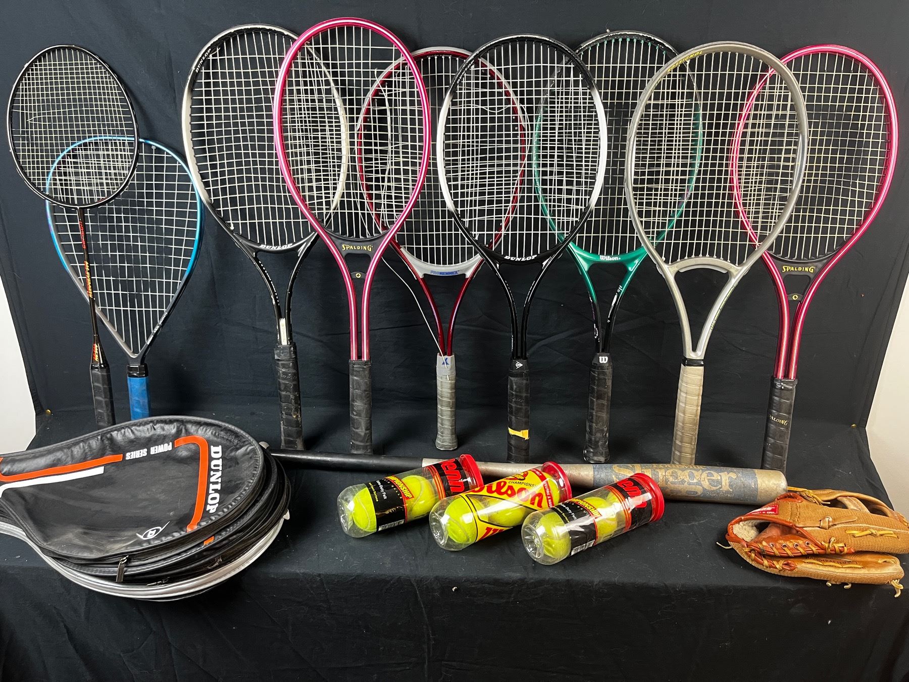 Dunlop, wilson and others, including one racketball racket, one badminton racket, lousiville slugger and mit. Some damaged.