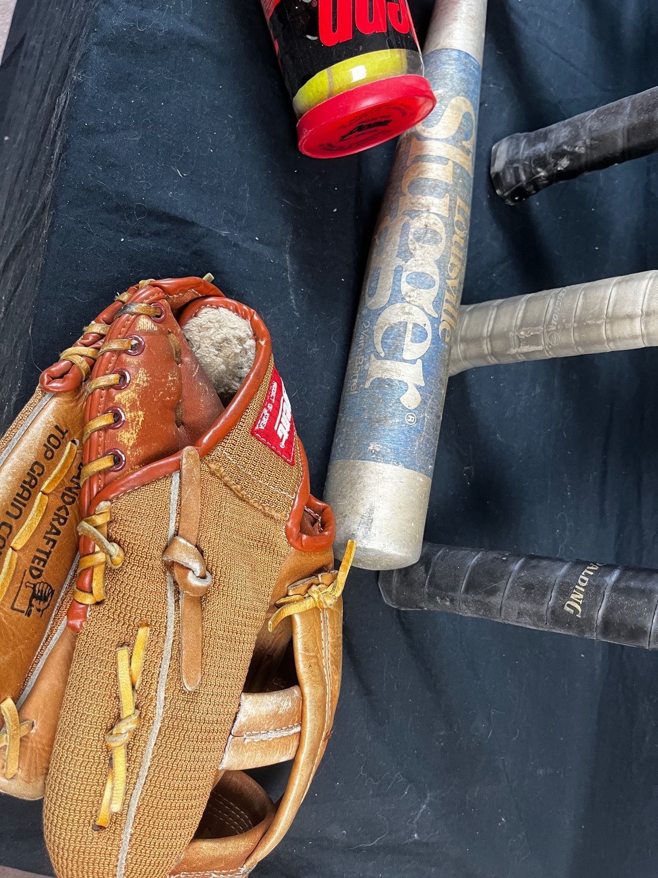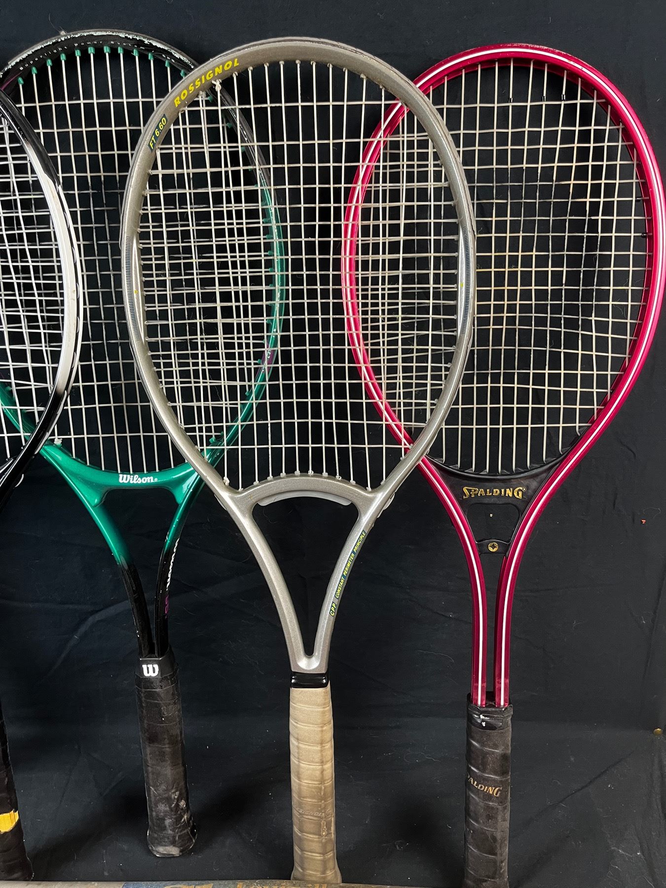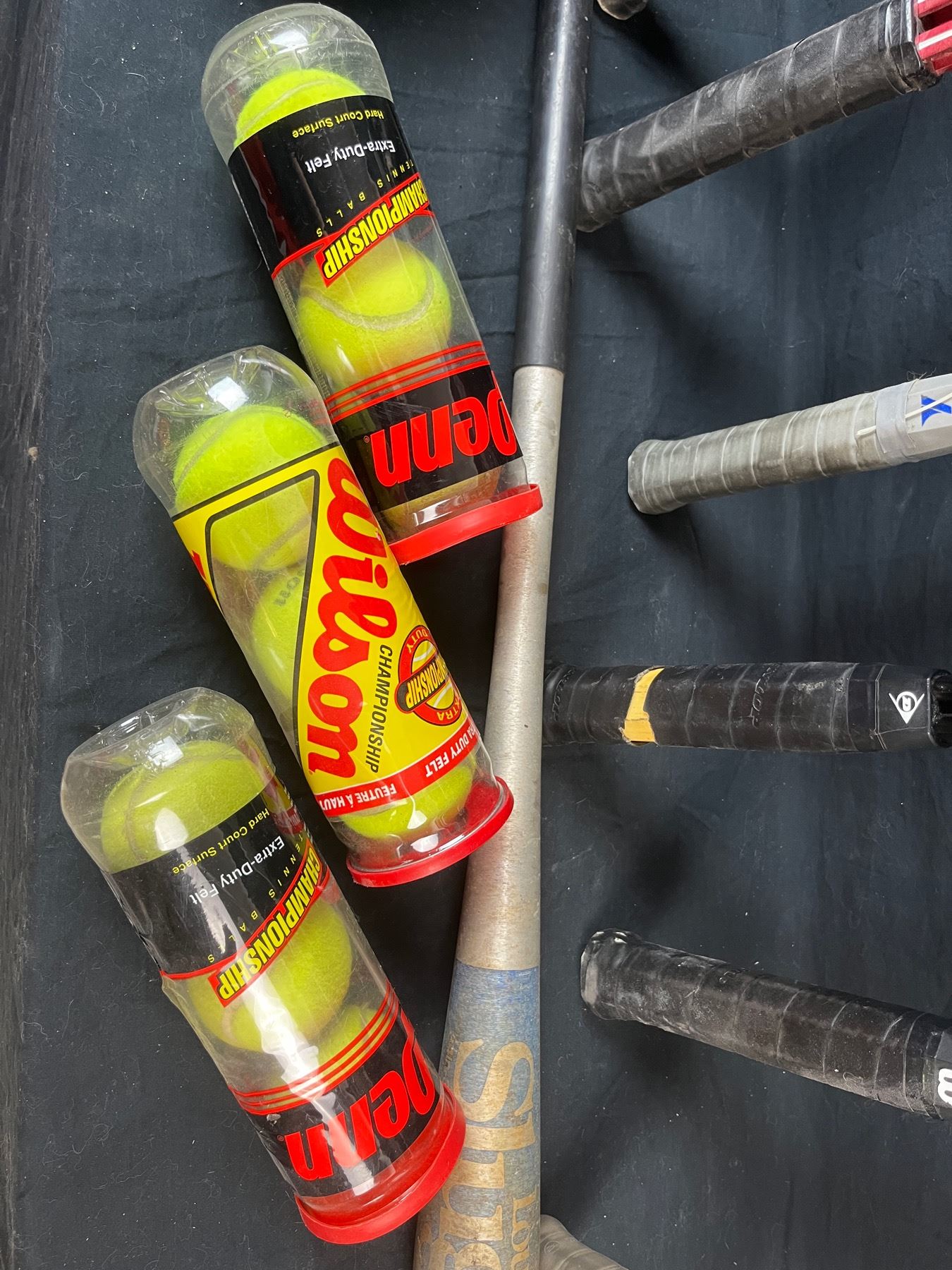 Dunlop, wilson and others, including one racketball racket, one badminton racket, lousiville slugger and mit. Some damaged.