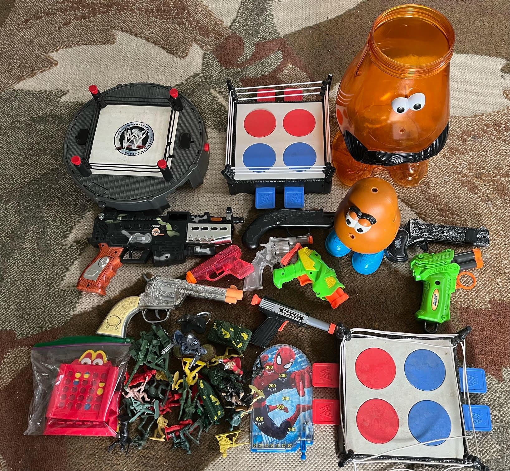 Mixed toy lot with wrestling rings, military action figures, toy guns and Mr Potato Heads (without accessories)
