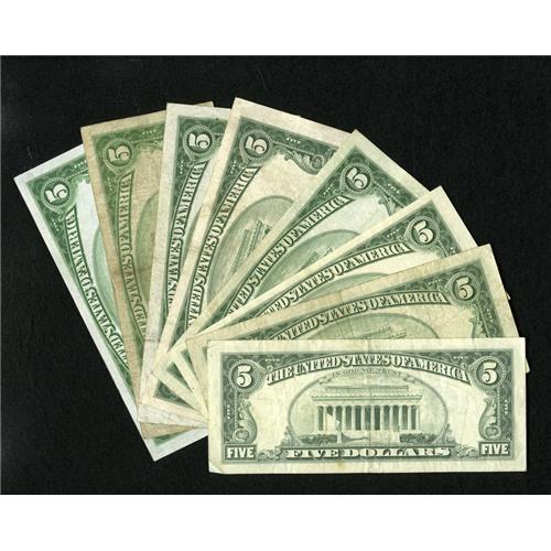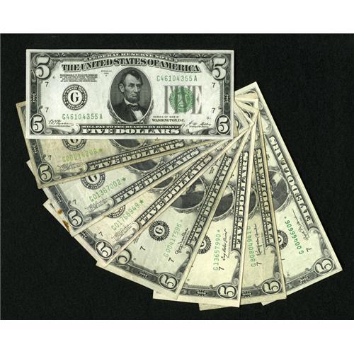 <B>Mixture of Eight $5 FRN Regular and Stars.</B></I><BR>The 1928B grades choice AU followed by four stars from the 1934 series and 1950 series grading in the Fine-Very Fine range. Finally a trio of notes in the VF-EF grade range follow from the 1950's and 1981.<BR><I>From The Bill and Kathy Stella Currency Collection</B></I><BR><BR><b>Shipping:</b> Coins & Currency (<a target="_blank" href="http://www.heritageauctions.com/common/shipping.php">view shipping information</a>)