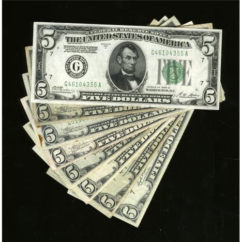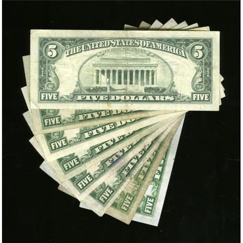 <B>Mixture of Eight $5 FRNs Regular and Stars</B></I><BR> The 1928B grades <B>Choice AU</B></I> followed by four stars from the 1934 series and 1950 series grading in the <B>Fine-Very Fine</B></I> range. Finally a trio of notes in the <B>VF-EF</B></I> grade range follow from the 1950's and 1981.<BR><BR><b>Shipping:</b> Coins & Currency (<a target="_blank" href="http://www.heritageauctions.com/common/shipping.php">view shipping information</a>)