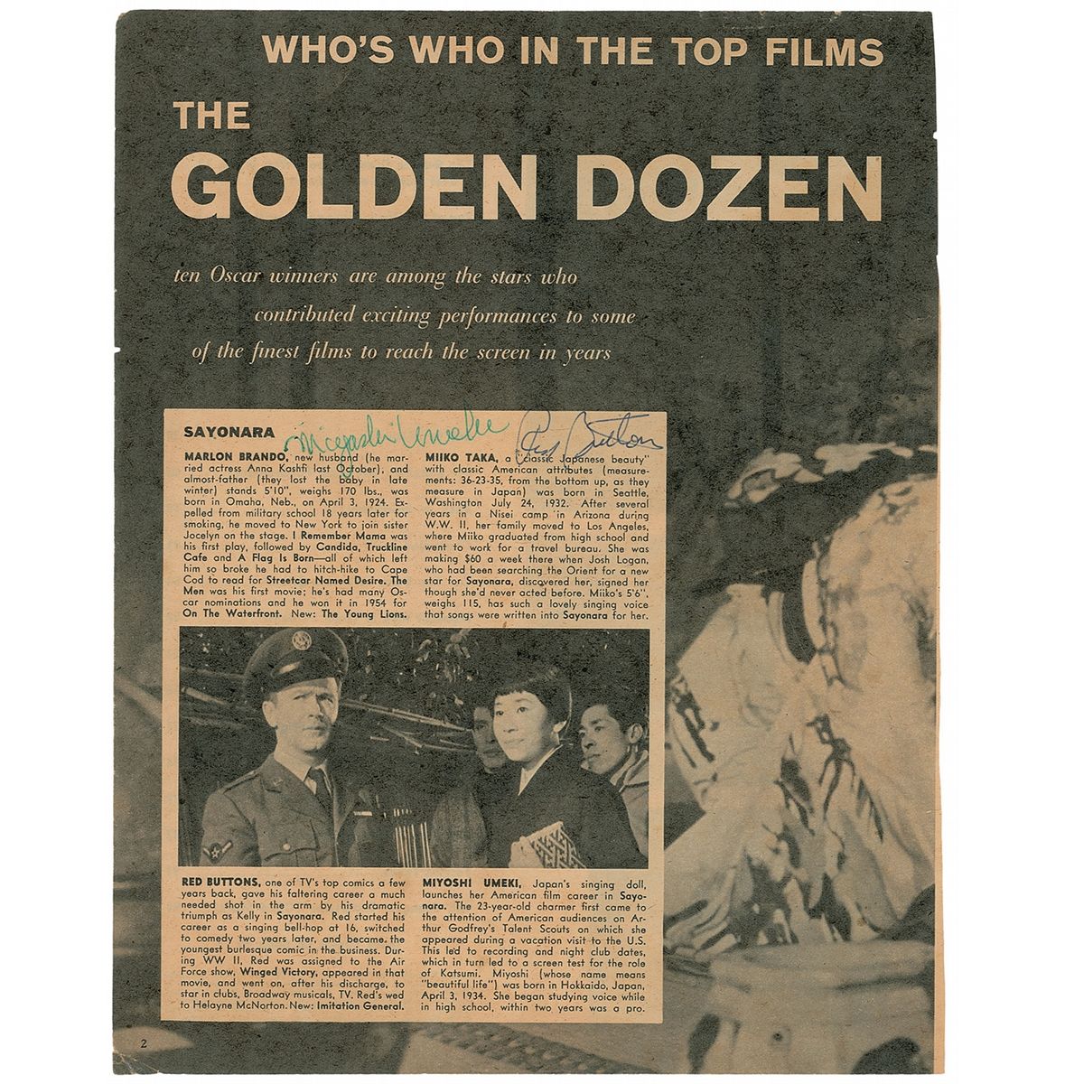 Magazine page removed from Who’s Who in Hollywood, 1958, 8.25 x 10.5, featuring a blurb about the award-winning film Sayonara with an image of Umeki and Buttons together in a scene, signed at the top of the article in ballpoint by both. Light toning and chipping to corners and edges, otherwise fine condition. Both received Oscars for their performances, with Buttons winning Best Actor in a Supporting Role and Umeki winning Best Actress in a Supporting Role. An uncommon combination.
