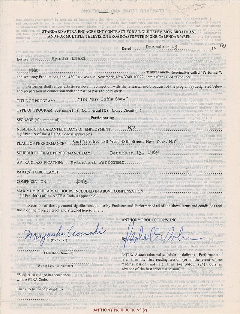 Japanese-born actress (1929–2007) best known for her Oscar-winning turn in Sayonara and for her role as Mrs. Livingston in the television series The Courtship of Eddie’s Father. DS, one page, 8.5 x 11, December 13, 1969. Standard AFTRA contract in which Umeki agrees to appear on The Merv Griffin Show on the same day in exchange for $265. Signed at the conclusion in ballpoint by Umeki. A standard AFTRA rider is stapled to the main document at the top. In fine condition, with expected document wear.