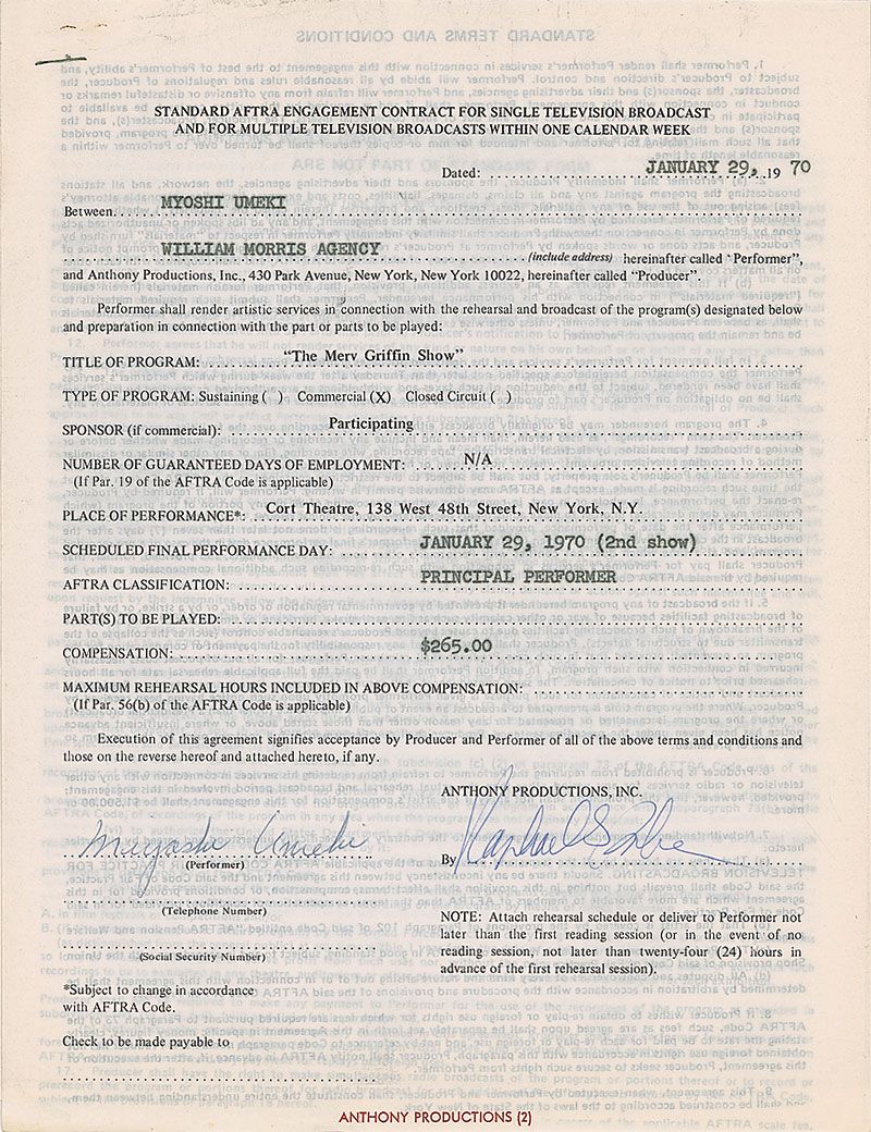 Japanese-born actress (1929–2007) best known for her Oscar-winning turn in Sayonara and for her role as Mrs. Livingston in the television series The Courtship of Eddie’s Father. DS, one page, 8.5 x 11, January 29, 1970. Standard AFTRA contract in which Umeki agrees to appear on The Merv Griffin Show on the same day in exchange for $265. Signed at the conclusion in ballpoint by Umeki. A standard AFTRA rider is stapled to the main document at the top. In fine condition, with expected document wear.