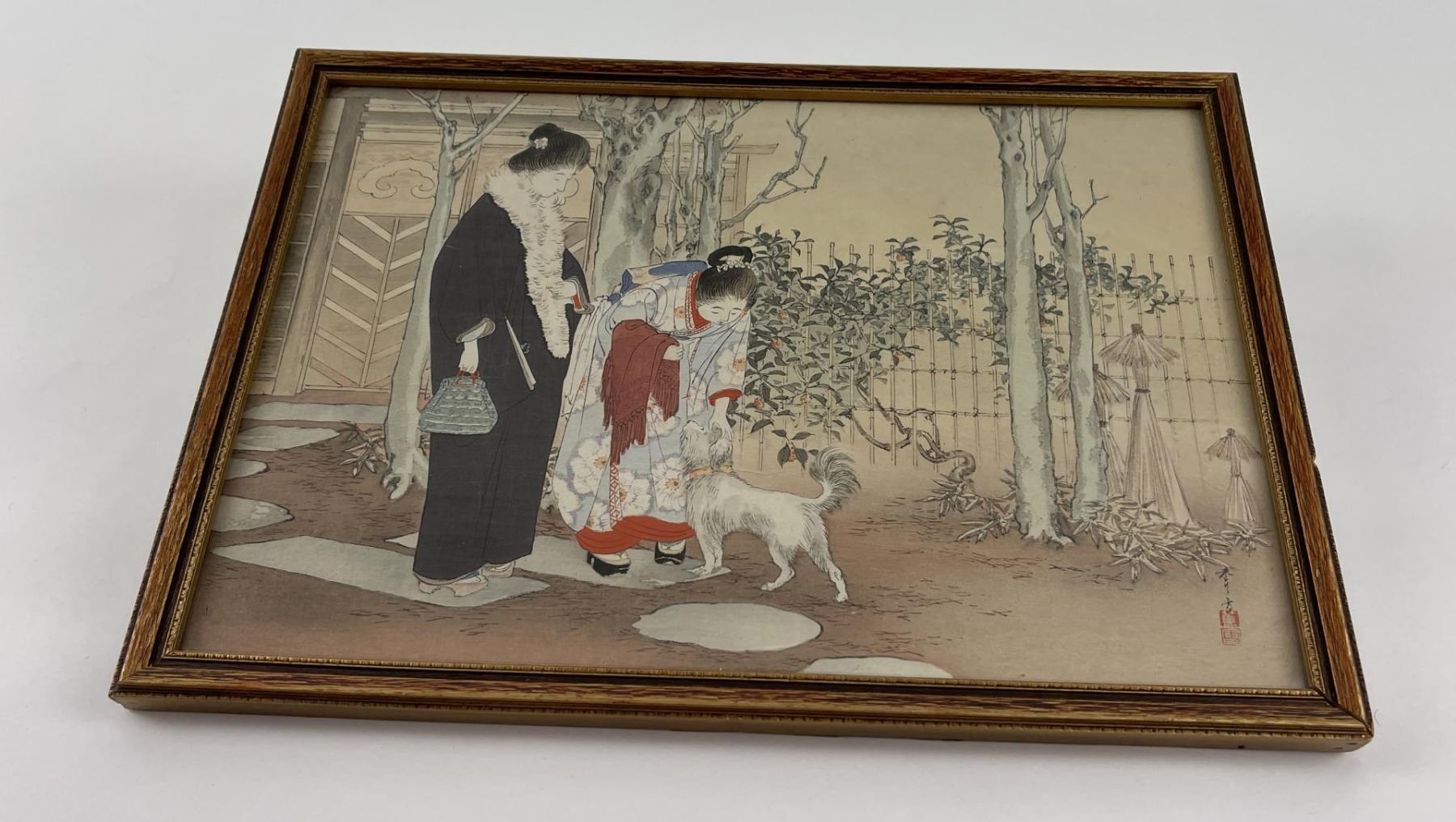 Very nice Japanese woodblock. Artist is Mizuno Toshikata. Title is Winter A Walk with A Pet Dog. 8.5" by 12" framed.