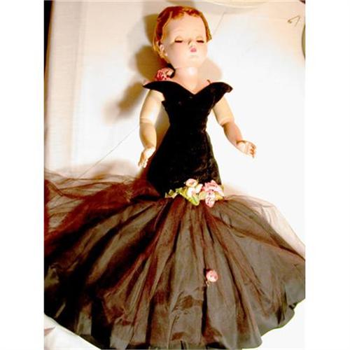 Here is a lovely "Cissy" in a beautiful black ball gown, velvet at the top with pink facings and pink rosebud accents. The skirt is a soft nyln tulle.