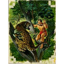 Mo Gollub - Original Cover Painting for Tarzan Comics (Dell, 1955). A fabulous piece by a true master, Gollub was also the artist on the Smokey the Bear strip from 1957-1959. Offered here is a beautiful cover painting of Tarzan facing down a snarling leopard high in the treetops! Oil on artboard, this piece measures approximately 15" x 20" and is in excellent condition. From the collection of Russ Cochran. Important notice: We expect to be auctioning lots at the rate of 200-250 per hour. Sometimes eBay Premier live bid software cannot keep up with that pace, so we strongly recommend that you place a realistic proxy bid now as insurance to avoid disappointment. Also please note that all Heritage/CAA lots purchased through eBay Premier carry a 20% Buyer's Premium.