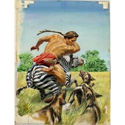 Mo Gollub - Original Cover Painting for Tarzan #71 (Dell, 1955). When the Dell series of Tarzan comic books started in the mid-1940s, the first covers were drawn by Jesse Marsh, who also did the interiors. After a time, other artists were given the assignment, and sometimes photographs of the current movie Tarzan (typically Lex Barker or Gordon Scott) were used on the covers.  Morris ("Mo") Gollub was without question the best artist to paint the Tarzan comic covers, with his version of Tarzan most resembling Lex Barker. Very few of his originals have survived, making this a unique opportunity for collectors. Oil on artboard, the piece measures approximately 15" x 20" and is in excellent condition. From the collection of Russ Cochran.Important notice: We expect to be auctioning lots at the rate of 200-250 per hour. Sometimes eBay Premier live bid software cannot keep up with that pace, so we strongly recommend that you place a realistic proxy bid now as insurance to avoid disappointment. Also please note that all Heritage/CAA lots purchased through eBay Premier carry a 20% Buyer's Premium.