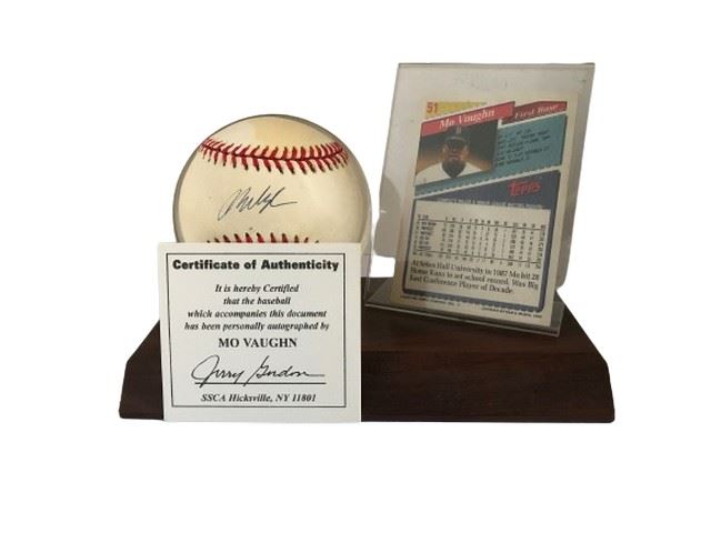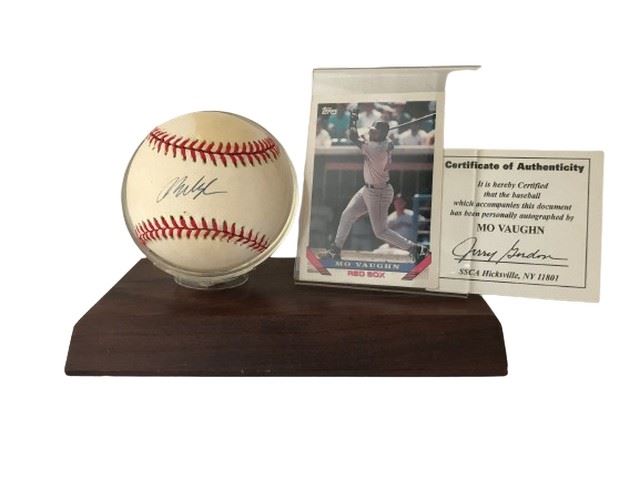 Mo Vaughn autographed baseball and trading card with SSCA certificate of authenticity. Ball and card are in acrylic displays mounted on wooden base.