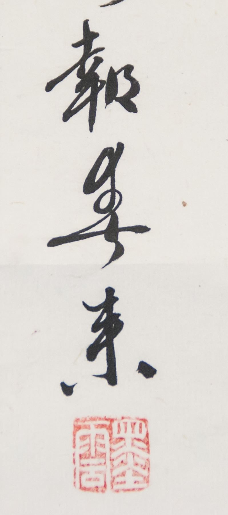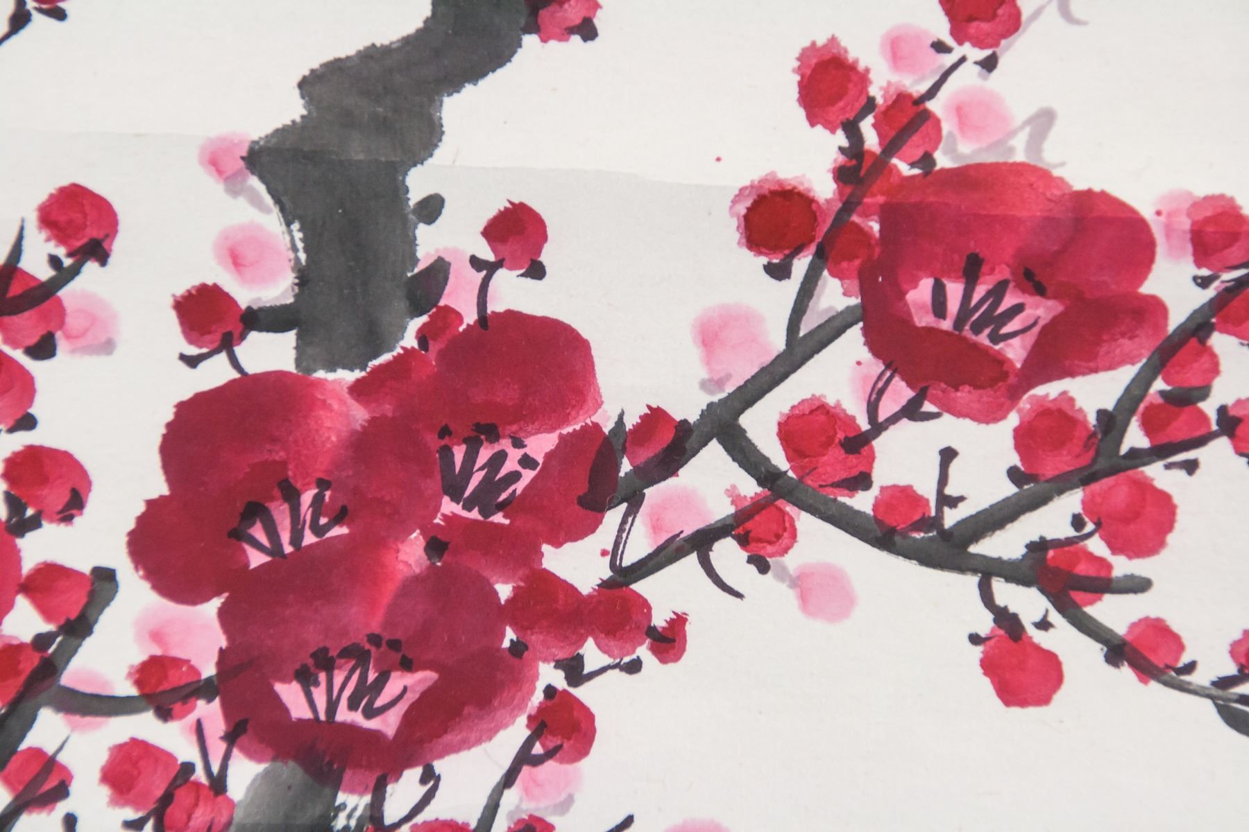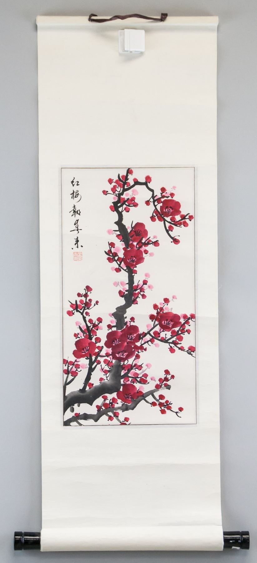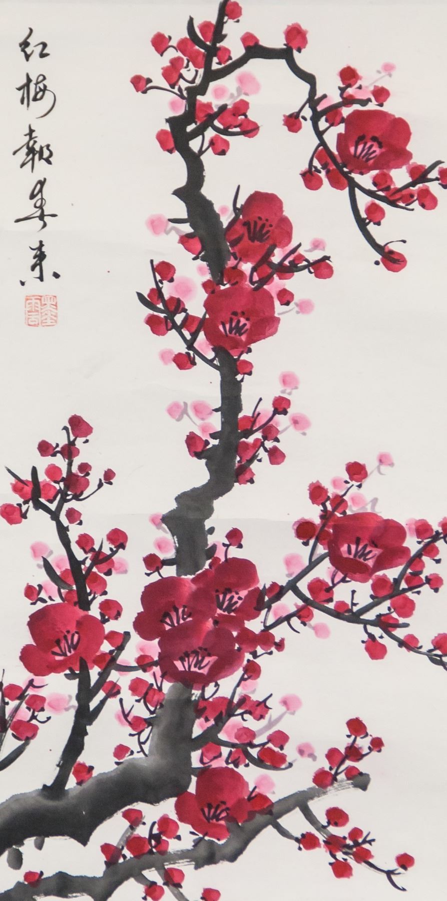 Chinese ink and watercolor on paper. Featuring red plum blossoms. Inscribed with one artist seal reading Mo Yun. 42 x 22 cm.
