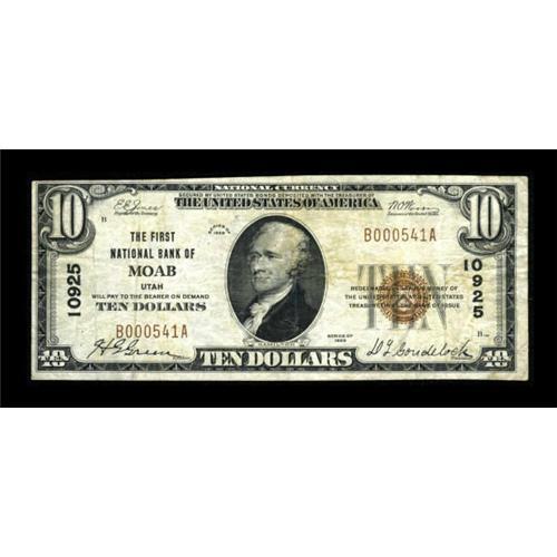 <B>Moab, UT</B></I> - $10 1929 Ty. 1 <B>The First NB</B></I> Ch. # 10925<BR> A just plain scarce note from the only bank to issue in Moab, a city of about 5,000 people located on the Colorado River. The city took its name from the biblical settlement of the same name, sharing a similar desert climate with temperatures that range from 120 degrees above zero to 20 degrees below zero. It is located in remote Grand County, and, while we are not certain, may well be the single most isolated national currency issuer in the lower 48. <B>Fine-Very Fine.</B></I><BR><BR><b>Shipping:</b> Coins & Currency (<a target="_blank" href="http://www.heritageauctions.com/common/shipping.php">view shipping information</a>)