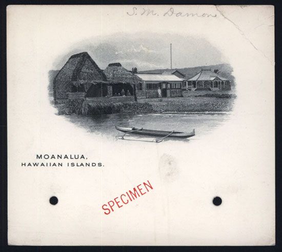 Moanalua, Hawaiian Islands, ND (ca.1890's-1900), Outrigger canoe plus waterside village building images on thick card with two security punches and red SPECIMEN hand stamp, Creased top right corner and light pencil notation, Fine condition. Scarce Hawaiian specimen piece, ABNC.