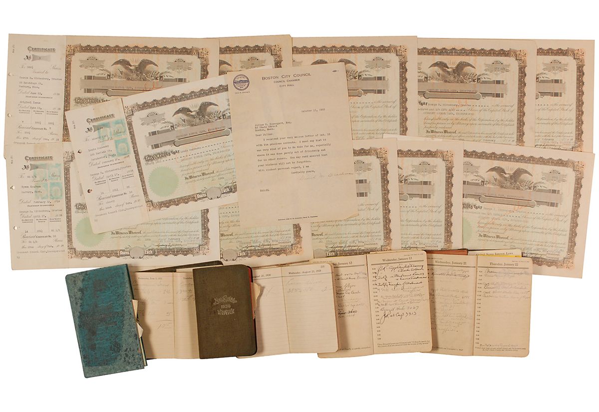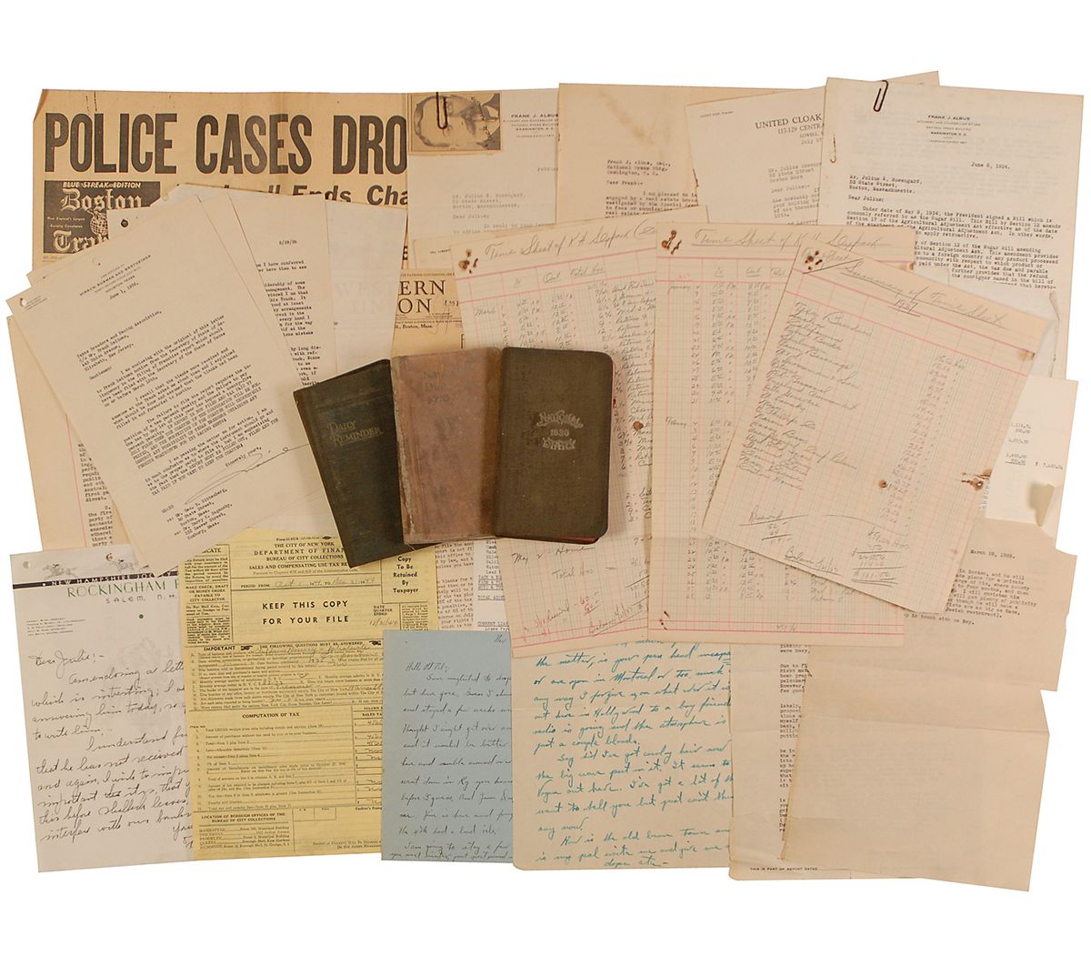 Huge archive consisting of hundreds of pages relating to various operations and activities, including betting and tax information, most to or from mob accountant Julius Rosengard. Included with the papers are six of Rosengard’s personal appointment books, from 1928 and 1930–1933. All of the appointment books have many appointments, numbers, and notes (mostly in pencil) in several different hands, most likely a secretary of Rosengard, with several mentions of the Cocoanut Grove and Charles ‘King’ Solomon, including an appointment with Rosengard just two weeks before Solomon was killed in the men’s room of Boston’s Cotton Club. Also included is correspondence from various other attorneys and companies, including Frank J. Albus; letters and receipts pertaining to the Paramount Theatre in Haverhill, MA; an illegal tax refund claim filed on behalf of the Cocoanut Grove after a violation found by the Prohibition Unit of the federal government; deposit slips; balance sheets of racing horse owner Howard M. Stack; tax forms; a letter to Boston Red Sox Douglas Taitt regarding the Red Sox and two boxers; stock certificates for the Crescent Kennel Club; a letter from Boston City Councilman David Brackman, hinting at some sort of payment; several checks from Anna Lansky; and hundreds of other pieces of correspondence and documents.