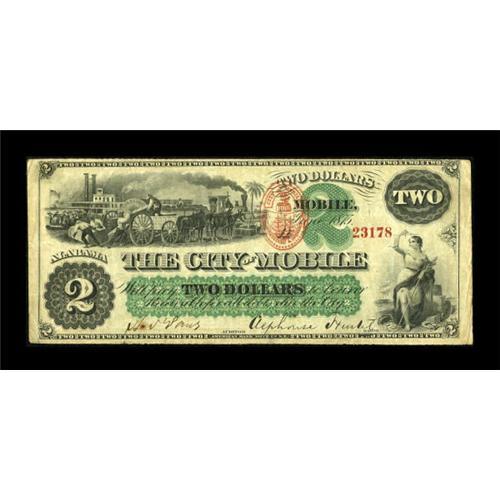 <B>Mobile, AL- City of Mobile</B></I> $2 June, 1875 Rosene 187E-2<BR> A scarce note, particularly in nice grade. <B>Extremely Fine,</B></I> with a red "paid" stamp and a bright green overprint. <BR><I>From The Collection of a Louisiana Gentleman.</B></I><BR><BR><b>Shipping:</b> Coins & Currency (<a target="_blank" href="http://www.heritageauctions.com/common/shipping.php">view shipping information</a>)
