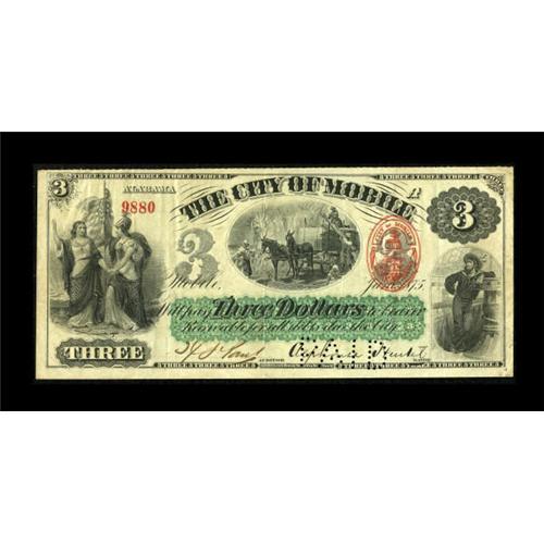 <B>Mobile, AL- City of Mobile</B></I> $3 June, 1875 Rosene 187E-3<BR> A lovely example of this rare note, with a bright red and green overprint setting off the vignette "Union" on the left. Nice <B>Very Fine+,</B></I> with a "Paid" cancellation through the Mayor's signature. <BR><I>From The Collection of a Louisiana Gentleman.</B></I><BR><BR><b>Shipping:</b> Coins & Currency (<a target="_blank" href="http://www.heritageauctions.com/common/shipping.php">view shipping information</a>)
