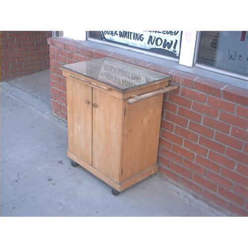 Mobile Cutting Board Island/ Cart. Measures 31.5" wide from handle to knife holder, 20" deep and 35" tall. This has a cutting board top, and below it has 2 cubbard doors which inside have wire racks to hold you kitchen stuff. Also comes with a piece of glass to cover the cutting board. It's all movable by its 4 plastic wheels. A great piece to have. In good condition. Priced to sell.