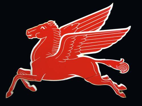 Mobile Oil Flying Pegasus Porcelain Sign, Cookie Cutter. Excellent condition with touch up around edges and corners. 93 inches long X 69 inches tall.