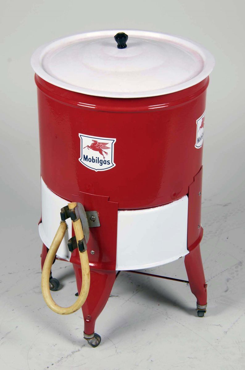 Small vintage washing machine with lid, motor, cord and hoses in Mobilgas Motif, Cord needs reattachment, Not tested, Red and white painted porcelain, Circa 1930's. Condition (Very good). Size 15" x 15" x 25"