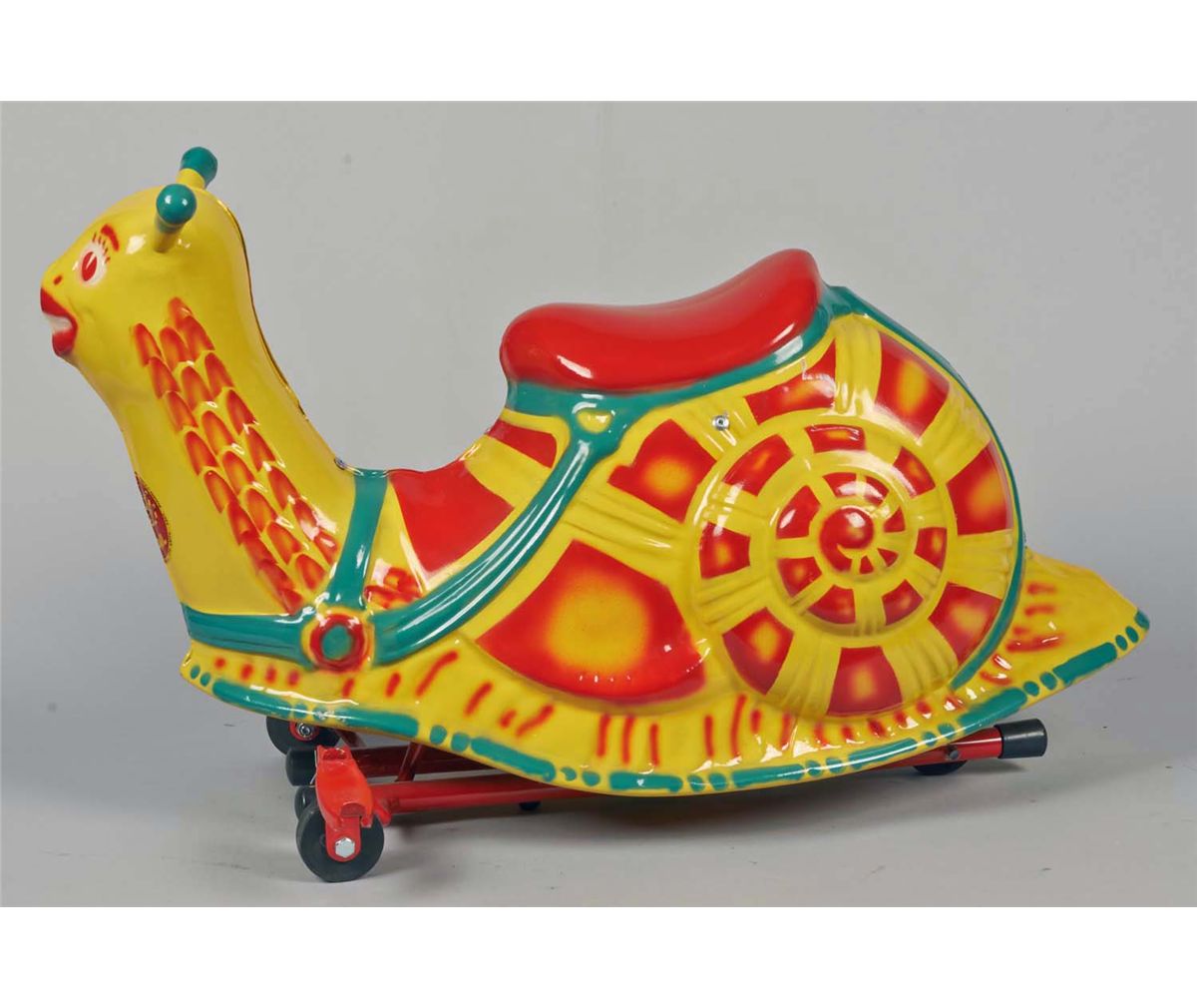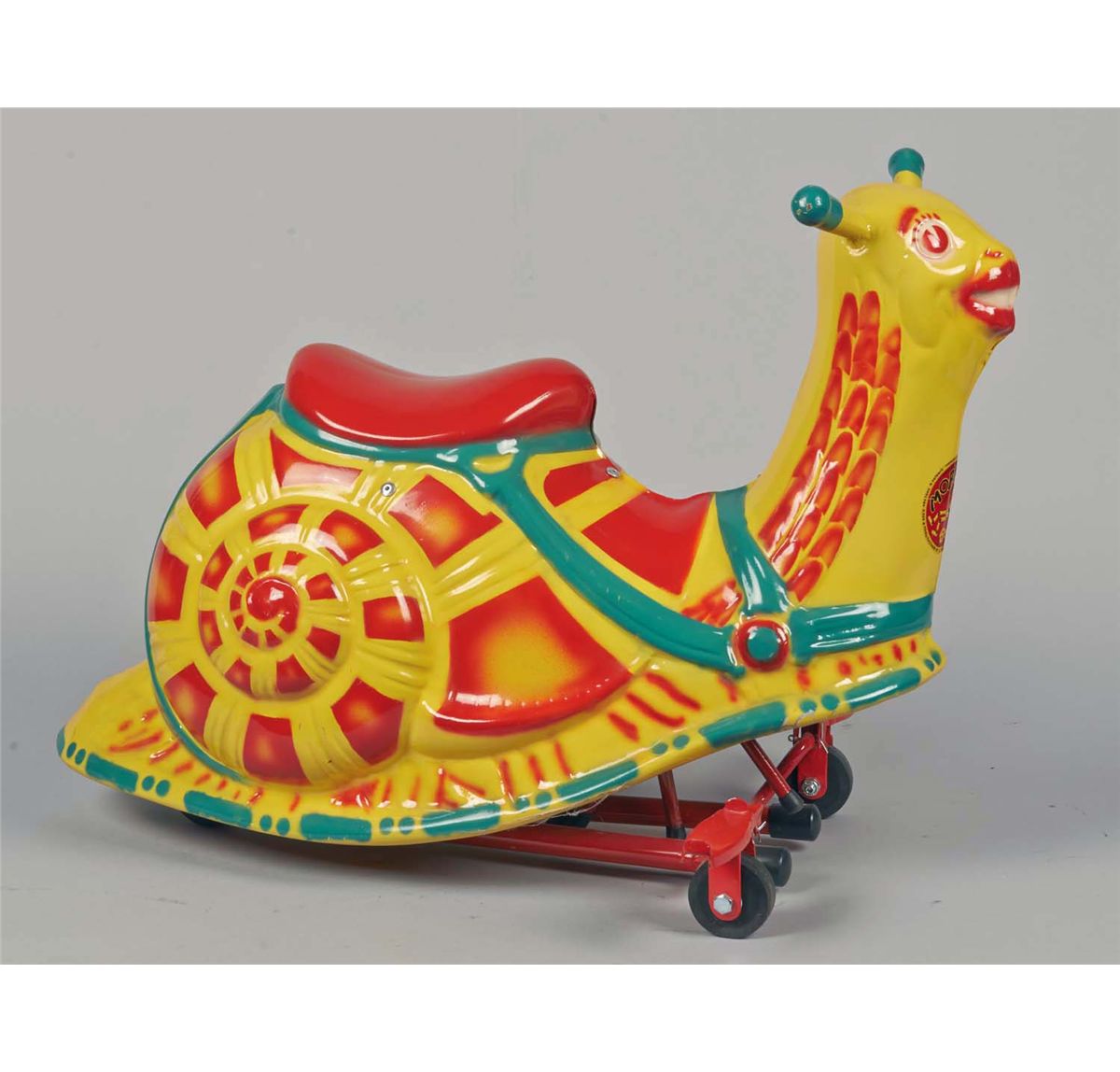 Toy crawler with ears used as handles. Propelled on wheels by forward movements. Condition (Very good). Size Approx. 12" x 30"