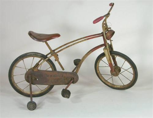 Mobo Childs bicycle with training wheels, 29 inches long, 20 inches tall, shows surface rust.