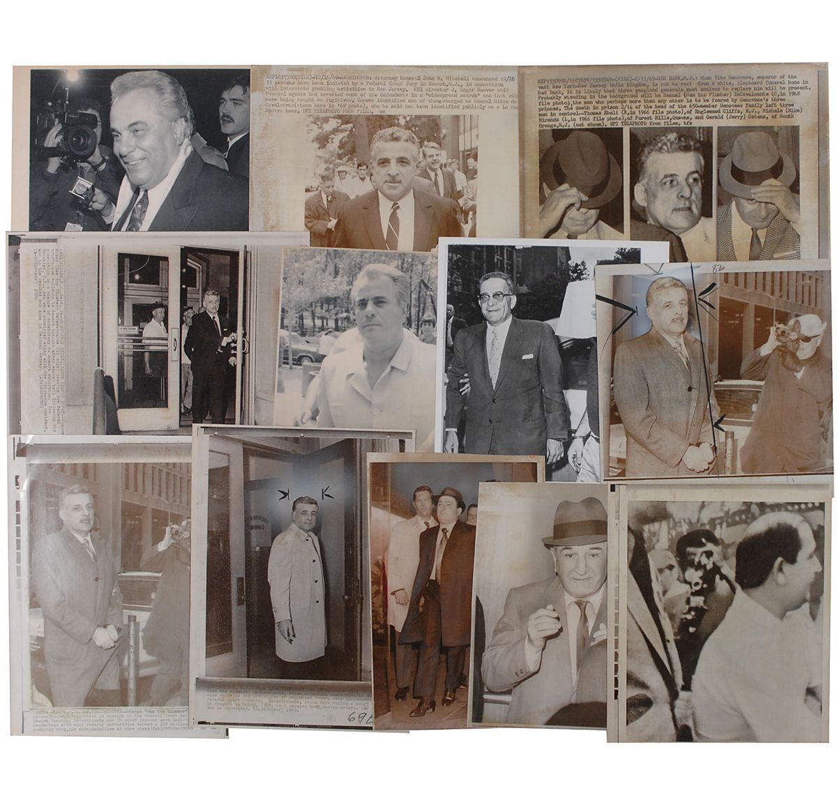 Twelve photos of different well-known mobsters, consisting of glossy press photos and printed wire photos, ranging in size from 7 x 8.75 to 11 x 8.25, including images of Joseph Colombo (2), Joseph Bonanno, Sam DeCavalcante (6), Vito Genovese, and John Gotti (2). Many are stamp-dated and bear affixed captions to the reverse, with dates ranging from 1958 to 1992. In overall fine condition, with normal news use and wear, including production marks and notes.