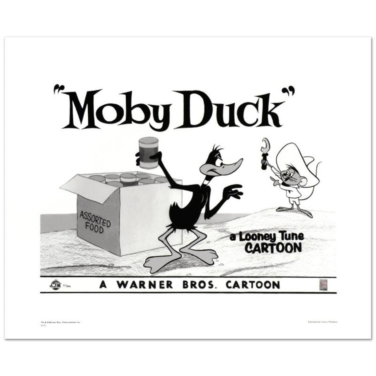 "Moby Duck - Daffy Duck & Speedy Gonzales" is a limited edition giclee on paper from Warner Bros., numbered with hologram seal of Authenticity. This image was originally used as a "lobby card" displayed in theater lobbies to publicize animated shorts. Also, includes Certificate of Authenticity! Measures approx. 20" x 16" (with border), 16" x 12" (image).