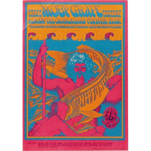 <B>Moby Grape "Neptune's Notion" Avalon Concert Poster FD-49 (Family Dog, 1967).</B></I> For those in the know, Moby Grape was one of the very best of the Bay Area bands during the "Summer of Love" era. Five musicians, all singers and songwriters, including the son of movie legend Loretta Young, plus former Jefferson Airplane drummer Skip Spence, now moved over to guitar. Opening for the Grape at this early Family Dog show was another local legend, the Charlatans. This Victor Moscoso-designed poster is a first printing, measuring approximately 14" x 20", in VG condition, with one light corner crease and tackholes.<BR><BR><b>Shipping:</b> Flat Material, Large (<a target="_blank" href="http://www.heritageauctions.com/common/shipping.php">view shipping information</a>)