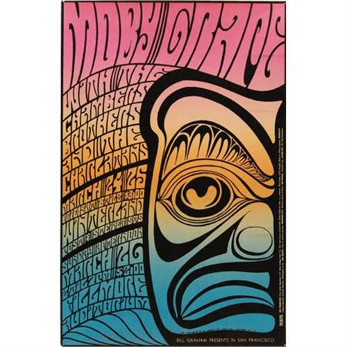 <B>Moby Grape Winterland/Fillmore Concert Poster BG-56 (Bill Graham, 1967).</B></I> The Bay Area rockers known for the songs "Hey Grandma" and "Omaha" headline this colorful Wes Wilson-designed, "tiki" style poster. Joining the Grape for these three nights were the Chambers Brothers and the Charlatans. This 13.75" x 21" poster was only printed once. This copy is in VG condition, with very minor edge wear and tackholes in all four corners.<BR><BR><b>Shipping:</b> Flat Material, Large (<a target="_blank" href="http://www.heritageauctions.com/common/shipping.php">view shipping information</a>)
