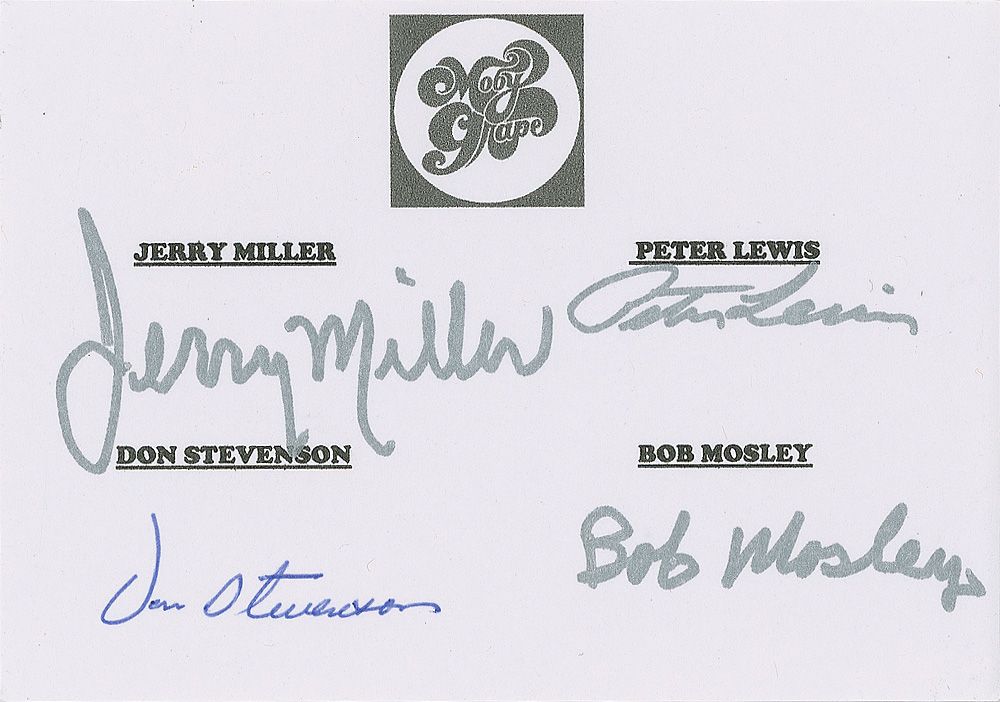 Silver ink and blue ballpoint signatures, “Jerry Miller,” “Don Stevenson,” “Peter Lewis,” and “Bob Mosley” from the original line-up on a 5 x 3.5 Moby Grape printed card. In fine condition.