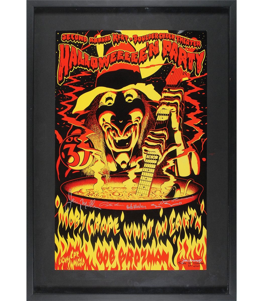 Color 15 x 24 second print poster from the band’s final reunion show in 1977, featuring amazing artwork by Jim Phillips, signed in silver ink by Jerry Miller, Don Stevenson, Skip Spence, Peter Lewis, and Bob Mosley. Also signed in silver ink by the artist, Jim Phillips. Framed to an overall size of 21 x 30. In fine condition.