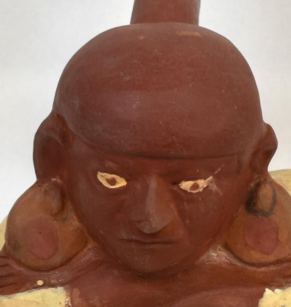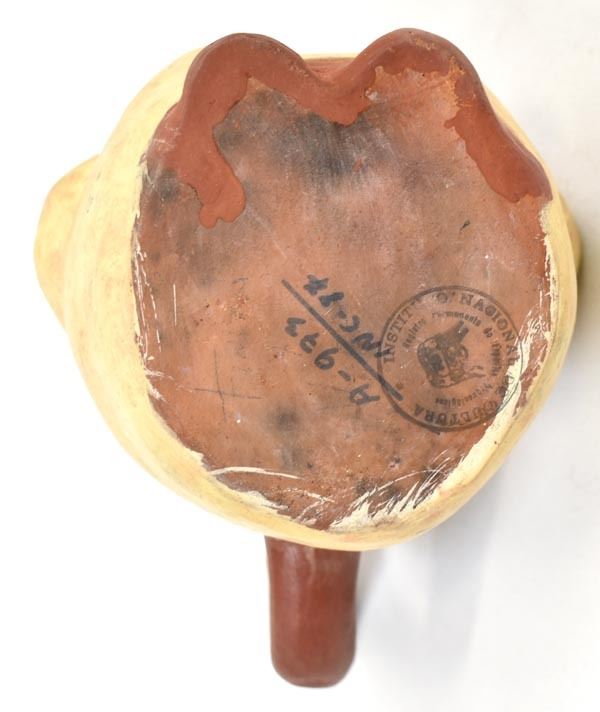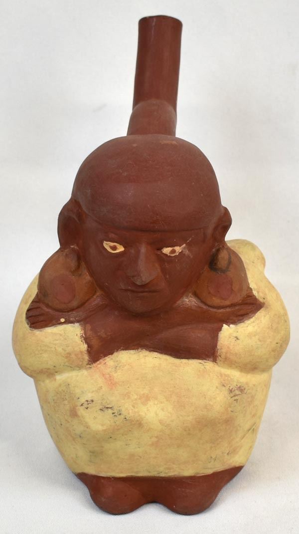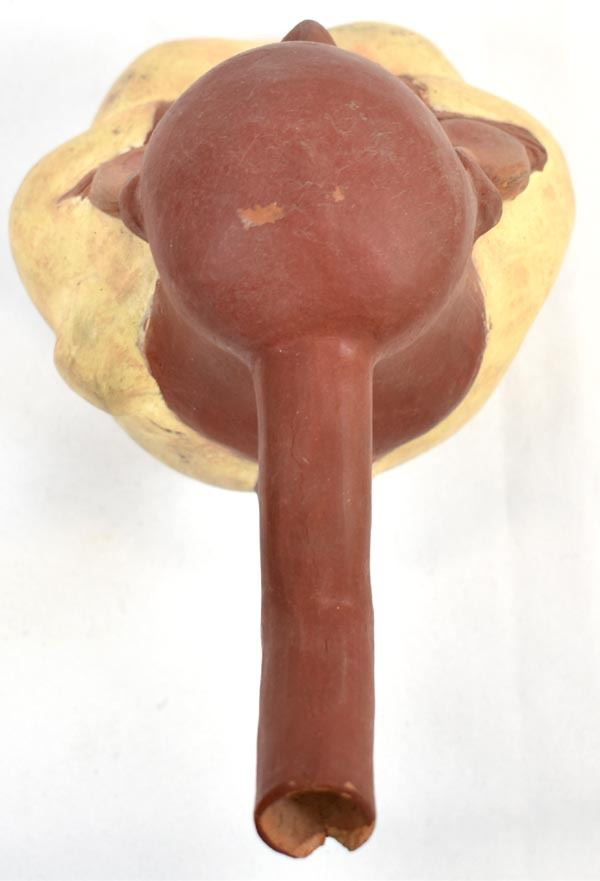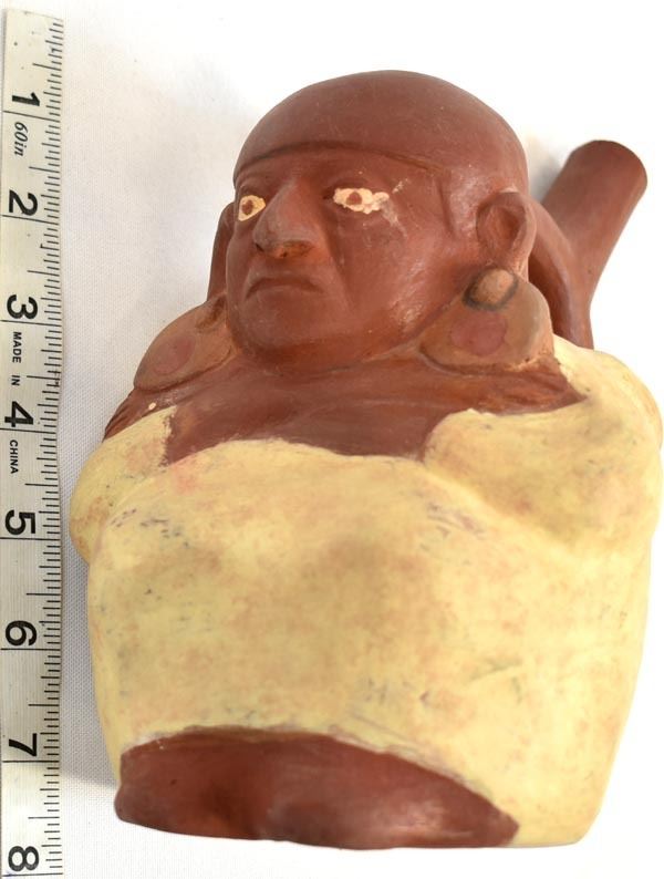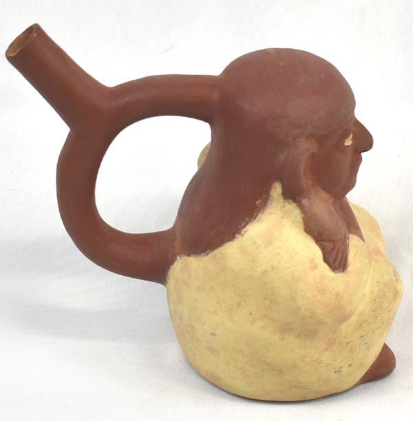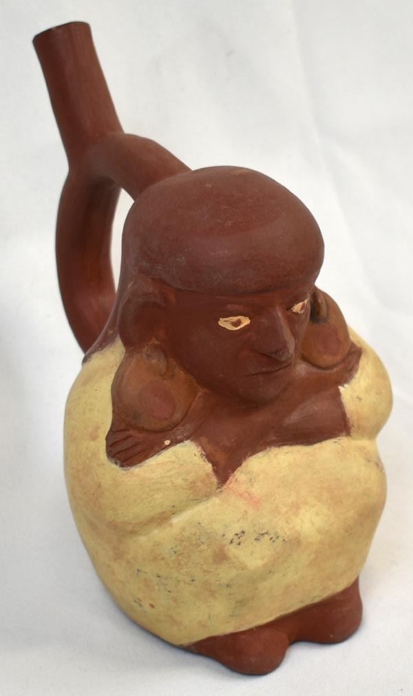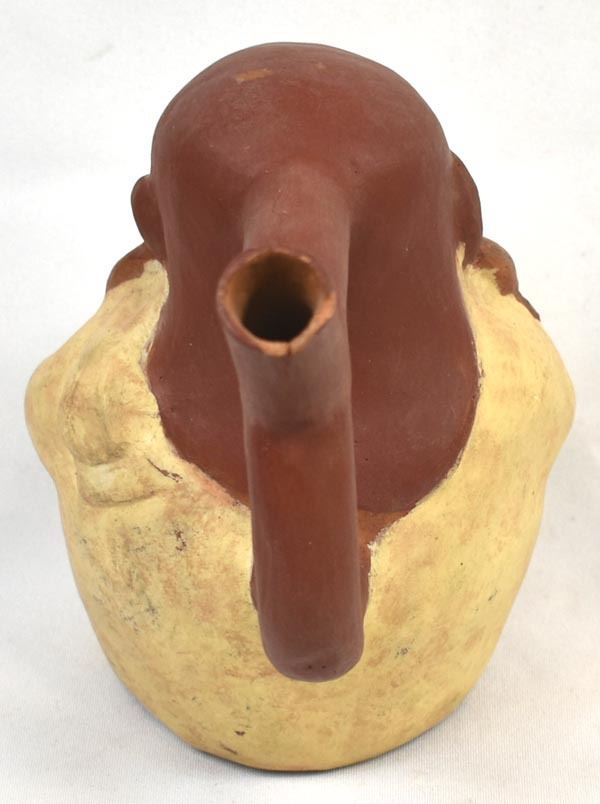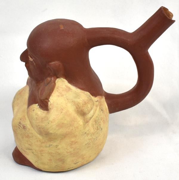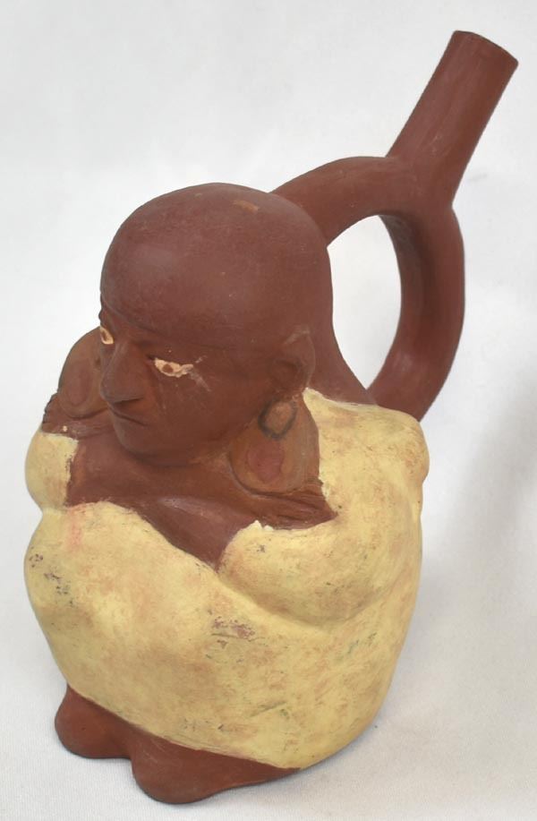 Moche' Culture Figural Pottery Stirrup Pot Replica, measures 6'' x 8'' x 5'', chip in spout
