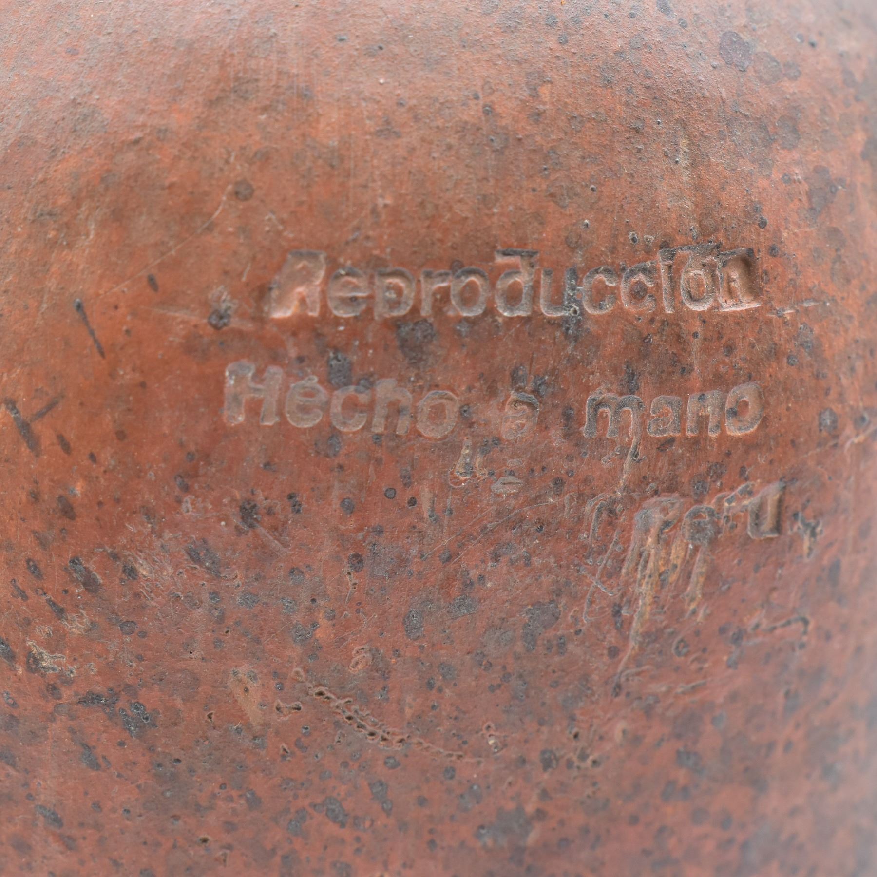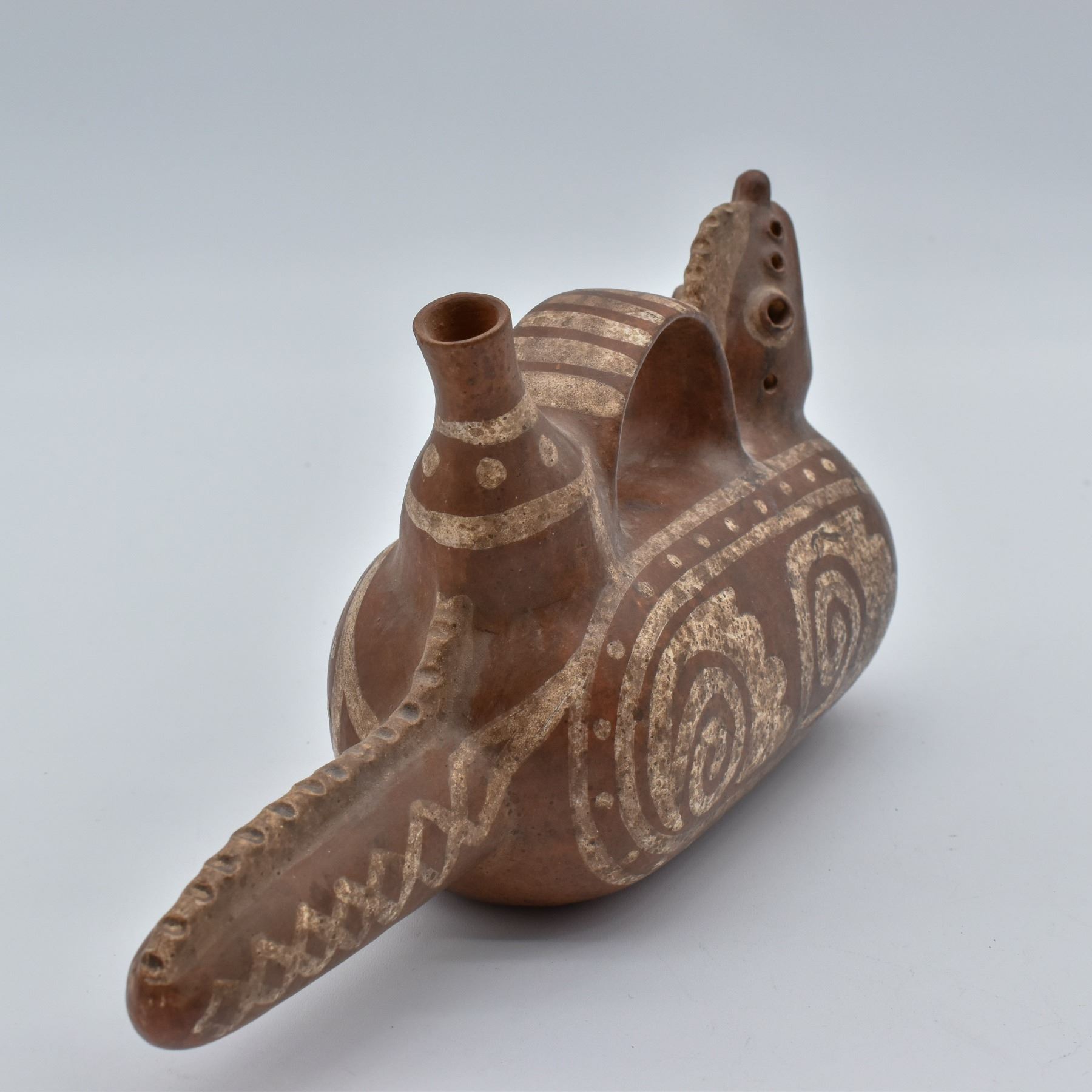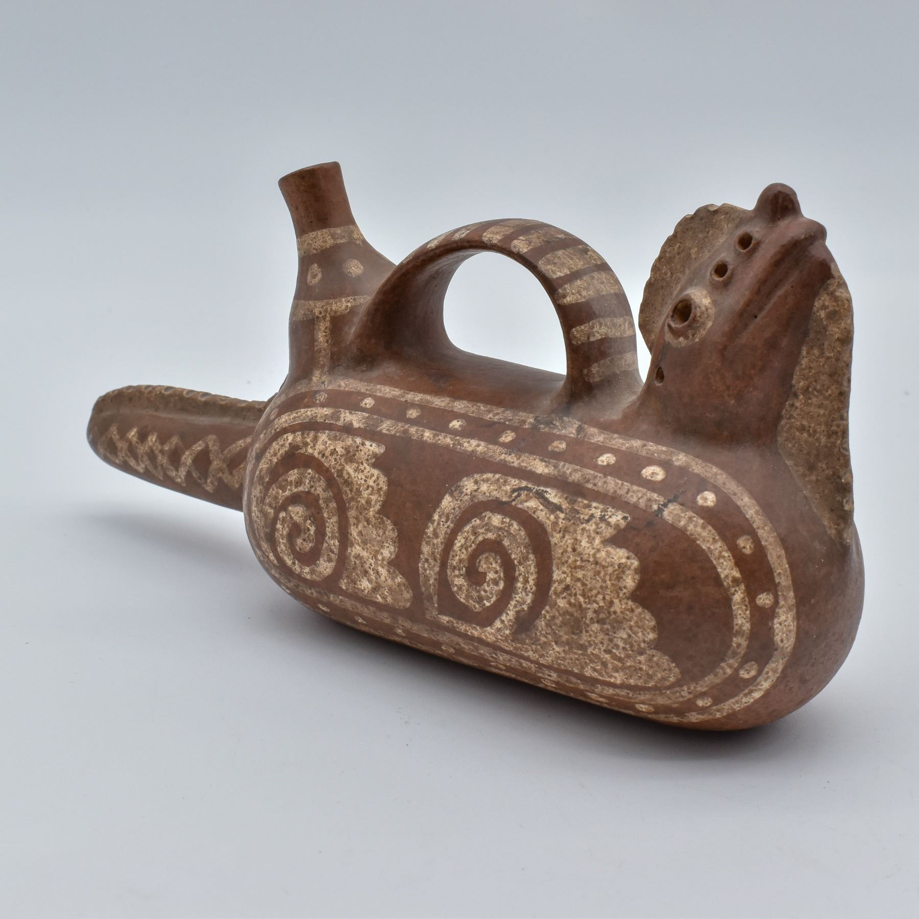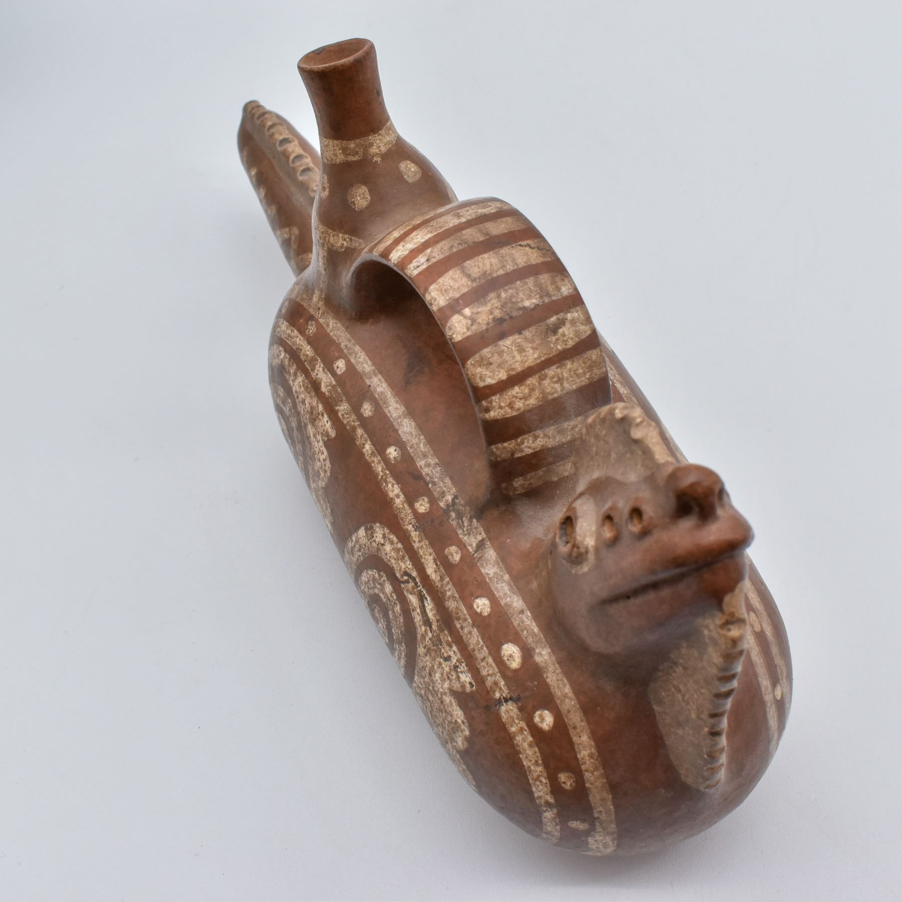 Moche' Culture Iguana Stirrup Pottery Replica, measures 5" x 9" x 3" Mochica culture or the Early, Pre- or Proto-Chimú) flourished in northern Peru with its capital near present-day Moche, Trujillo, Peru from about 100 to 700 AD during the Regional Development Epoch.