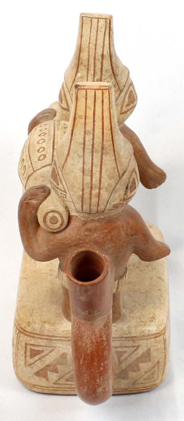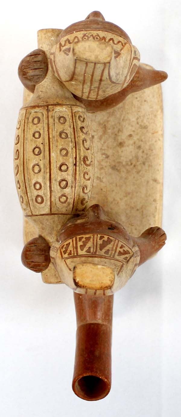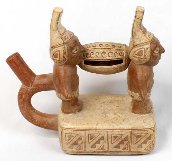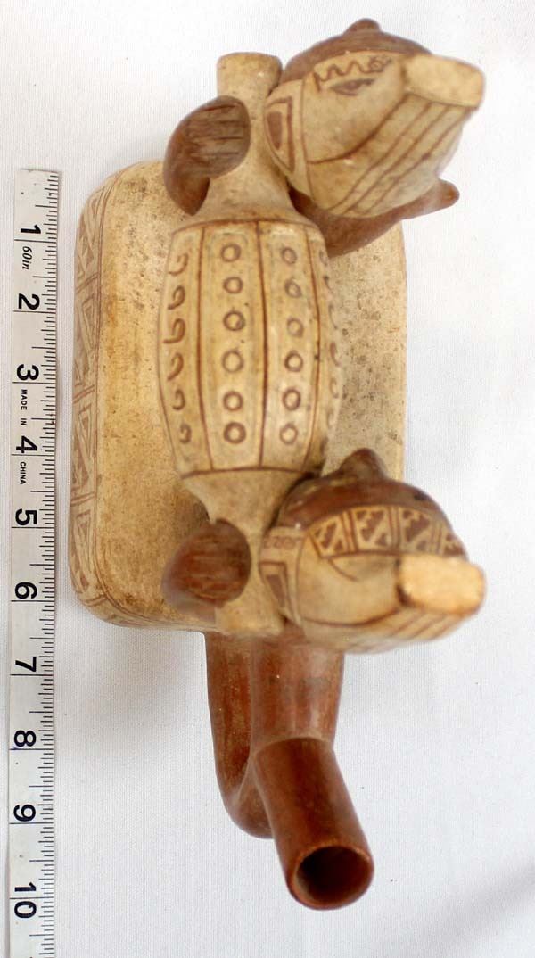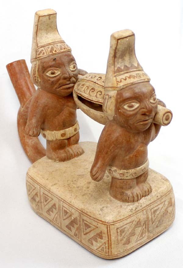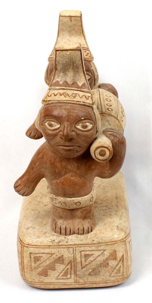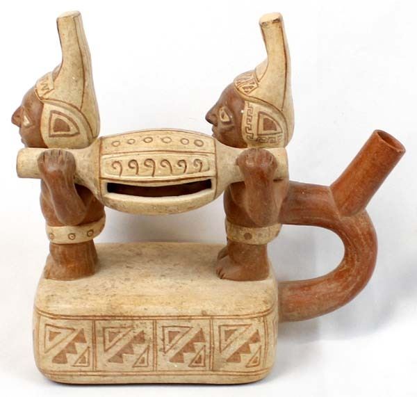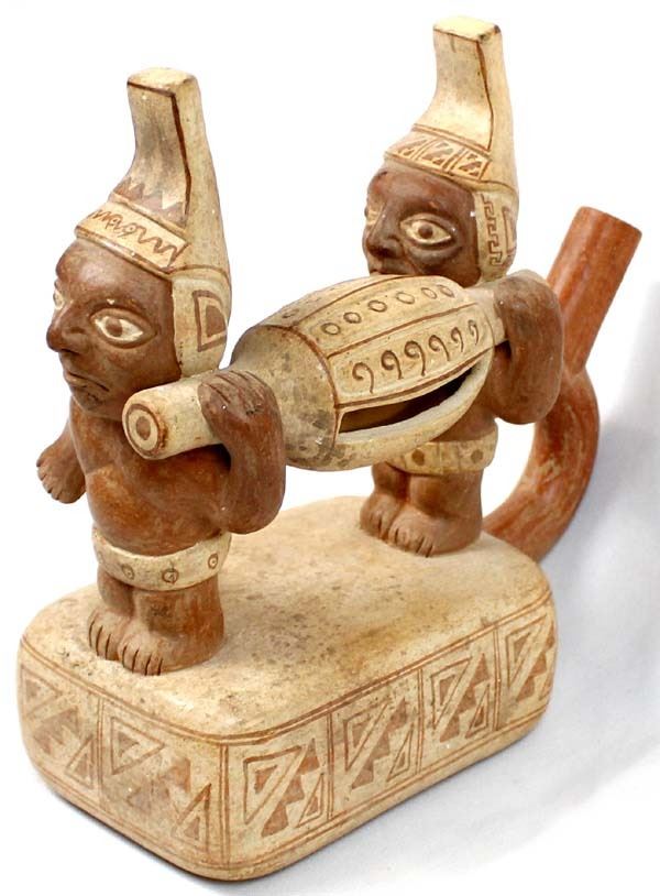 Moche' Culture Stirrup Pottery Replica, measures 9'' x 4'' x 9'', possibly depicting either a funeral procession for a baby or a sacrificial procession