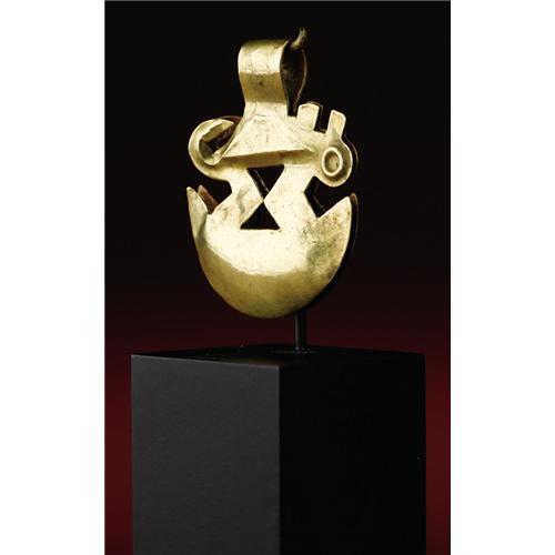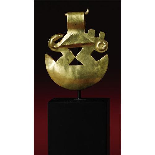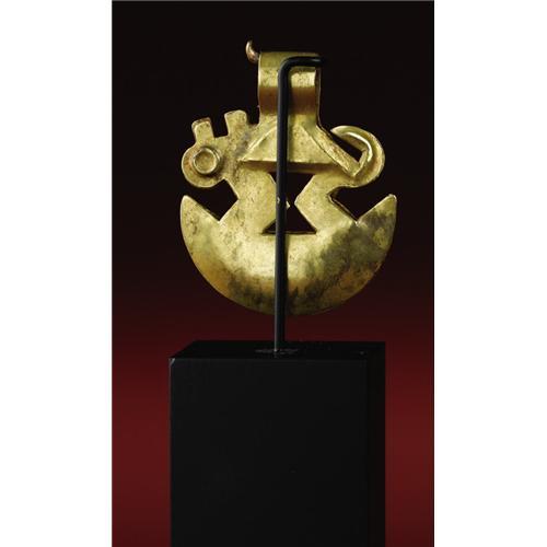 <B>Tweezers Surmounted by a Profile Animal Figure</B></I><BR>Moche<BR>A.D. 100 - 500<BR>Gold, traces of red pigment, Weight 0.8 grams<BR>Height 1 5/8 in. Width 1 5/16 in.<BR><BR>Small gold tweezers with a top loop allowing for suspension on a cord formed a part of upper classic regalia in Moche Peru. With bold silhouetting and a few simple repoussé elements, a surprisingly lively profile animal has been created atop the broad tweezer area. Other than minor surface stains, the condition is good.<BR><BR>Provenance<BR>Splendors of the World, Haiku, Hawaii<BR><BR>