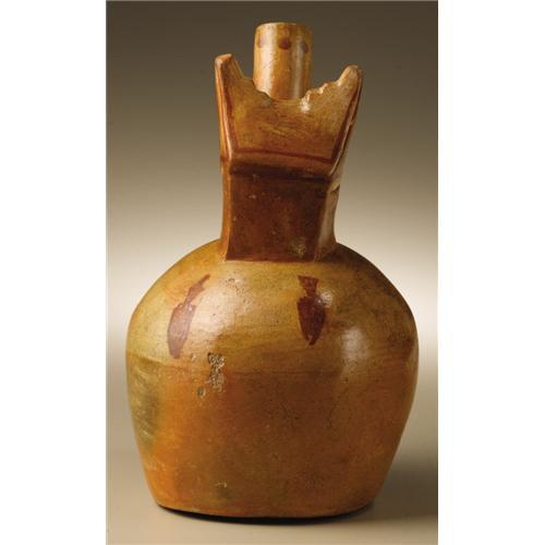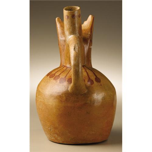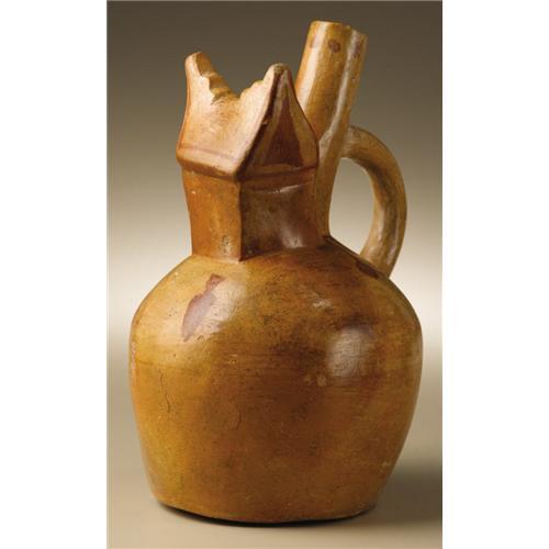 <B>Half Stirrup-spout Vessel with Twin-peaked Building</B></I><BR>Moche<BR>A.D. 300 - 600<BR>Burnished orangeware, with red slip<BR>Height 9 in. Diameter 5 3/4 in.<BR><BR>A simple rectangular structure is set atop the globular vessel, its roof stepped upward to peaks at either end. A red slip was used to pick up roof details, as well as showing what are probably two covered jars set near the building. A fanned arrangement of disk shapes at the end of cords is painted on the back surface under the arch of the spout. Small holes in the vessel body have been repaired and there is some surface chipping.<BR><BR>Provenance<BR>Bonhams & Butterfields, San Francisco: sale 7437E, 9 June 2003, lot 5075, pp.18-19<BR><BR>