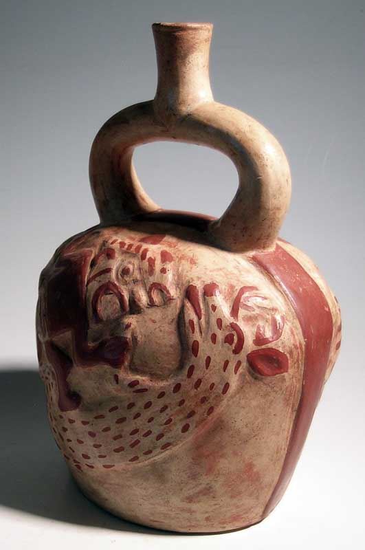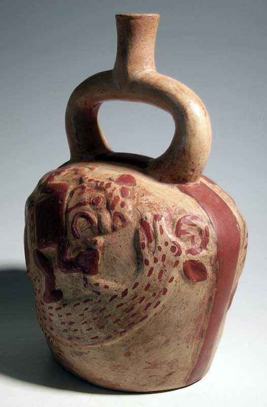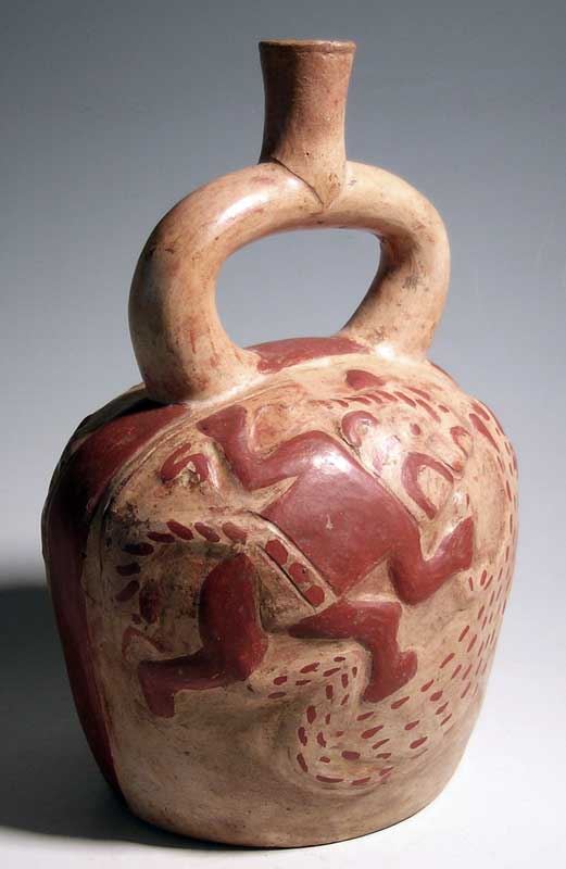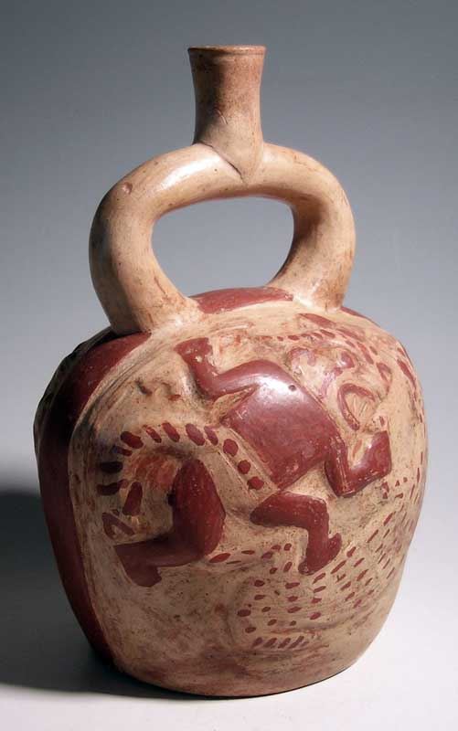 A choice Moche III molded bottle from Peru, c. AD 200 - 450, featuring two depictions of the Supernatural warrior Wrinkleface, identified by his serpent belt, hunting a deer. The scenes are molded in relief and details are enhanced with paint. H: 8 3/4 in. Intact, with strong mineral deposits. Ex Gallatin estate.