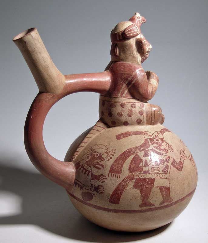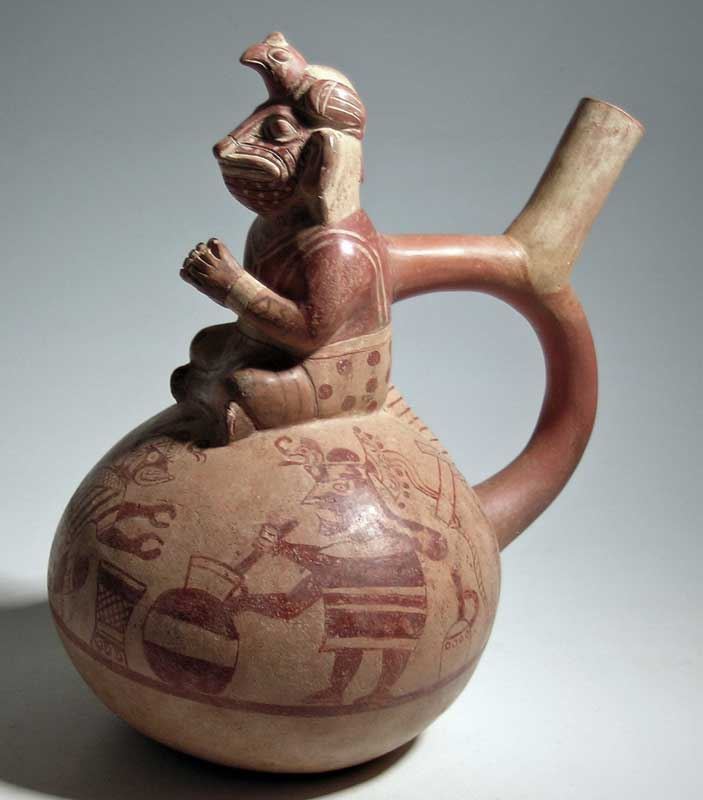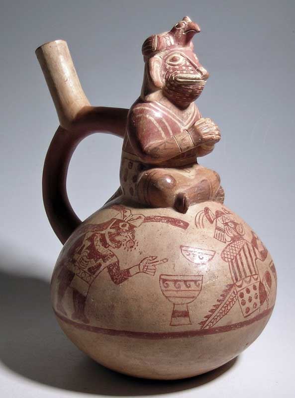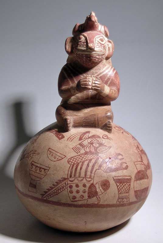 An awesome Moche IV figural Fineline vessel from Peru, c. AD 450 - 550, seated atop the chamber is the Supernatural warrior The Lizard, executed in exceptional detail, holding his hands in a gesture of anticipation. The Fineline scene depicts four mythological characters in the performance of a ritual, including a second portrayal of The Lizard. Overall in excellent condition, with strong paint and good mineral deposits. Professional restoration of a break is hardly visible and does not detract. Ex Caravallo collection.