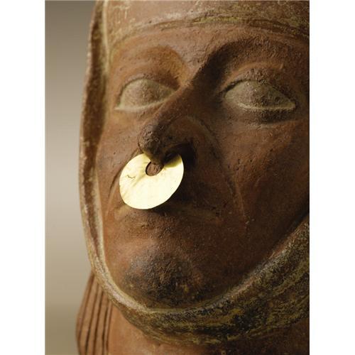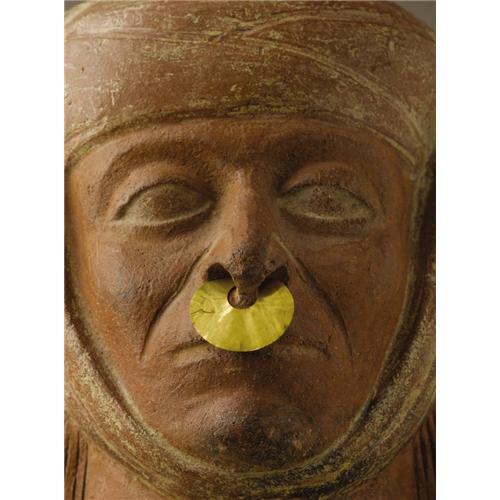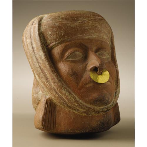 <B>Portrait Vessel</B></I><BR>Moche<BR>A.D. 300 - 600<BR>Ceramic<BR>Height 7 in. Width 5 1/2 in.<BR><BR>The turban-like head covering secured with a cloth band under the chin is one frequently seen in Moche mode of dress. Strands of the hair show below the chinstrap at either side. The shape of this vessel indicates that it may have been used as a cup. The overall condition is good, with a minor rim chip at back and light abrasion on the tip of the nose.<BR><BR>Provenance<BR>Bonhams & Butterfields, San Francisco: sale 7477E, 8 December 2003, lot 3058, pp.18-19<BR><BR> <BR><BR><B>Important notice:<