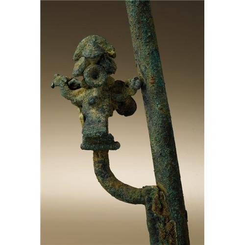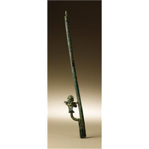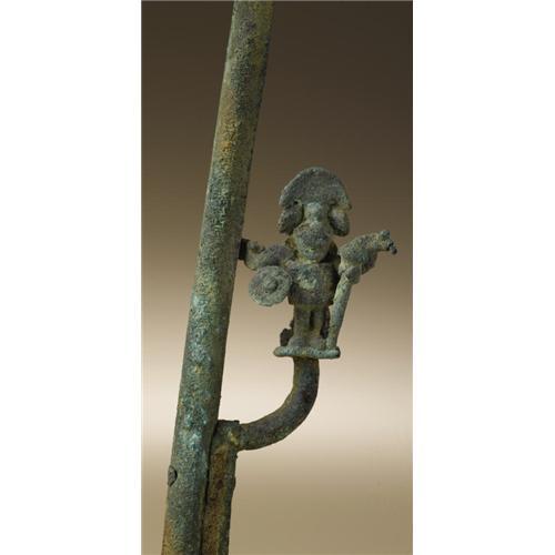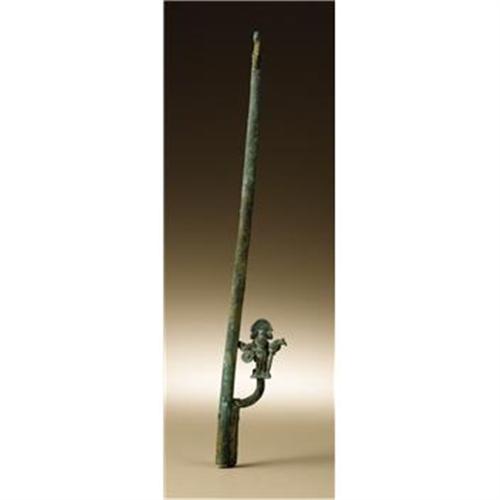 <B>Spear Thrower with Effigy of a Standing Warrior</B></I><BR>Moche<BR>A.D. 100 - 600<BR>Copper<BR>Length 13 in. Width 1 7/8 in.<BR><BR>This spear thrower is made of three components: a fabricated rolled tube, a cast dart hook, and an elaborately-developed cast thumb rest. Brads were used to attach the cast pieces to the shaft, and impressions in the age patination indicate that the dart hook was further stabilized with a cord wrapping. The thumb rest shows an armed warrior standing on a platform. His complex headdress includes a crescent-shaped centerpiece with a mask at its base, while behind this is a war club head amid three bowl-shaped forms. From the front the side two bowl-shapes are in part visible below the blade. The warrior wears a tunic, which once showed checkerboard divisions. A war club is propped against his left arm and a circular shield with central boss against his right. In his raised hands he holds two pointed objects reminiscent of the bags carried by runners in various painted representations. A flap hangs down from his back, with an eroded projection centered on his back. The whole may originally have shown an animal pelt pouch. Green encrusted age patination covers the spear thrower, with rust at the jointure of thumb rest and shaft.<BR><BR>Provenance<BR>Splendors of the World, Haiku, Hawaii<BR><BR>