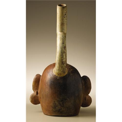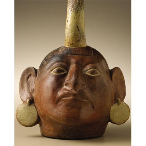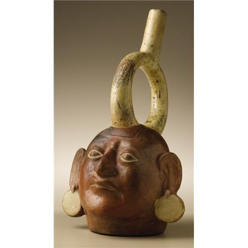 <B>Stirrup-spout Portrait Vessel</B></I><BR>Moche<BR>A.D. 300 - 600<BR>Burnished and slipped ceramic<BR>Height 11 1/4 in. Width 6 7/8 in.<BR><BR>The vessel shows a full-faced male wearing disk earrings, the stirrup-spout oriented in line with his nose. The front base of the spout issues from a clipped shock of hair above the central forehead. An expression of self-assurance animates the portrait. Such vessels were made from molds in considerable numbers. Since images of the same person have been found in varying contexts, it is thought that the portrait vessels were important in Moche socio-political exchanges. The overall condition is good, with minor abrasions and chipping at the rim of the spout. Both ears have been repaired and infilled.<BR><BR>Provenance<BR>Bonhams & Butterfields, San Francisco: sale 7437E, 9 June 2003, lot 5091, pp.21, 22<BR><BR>