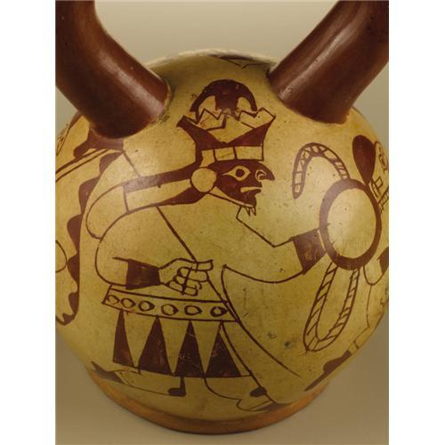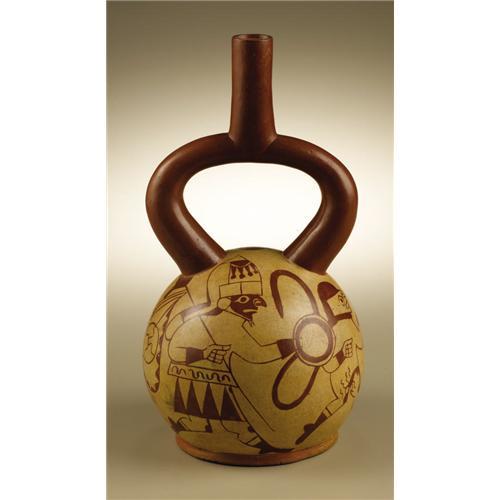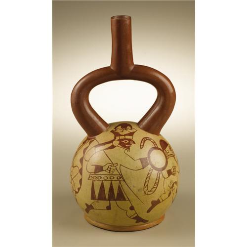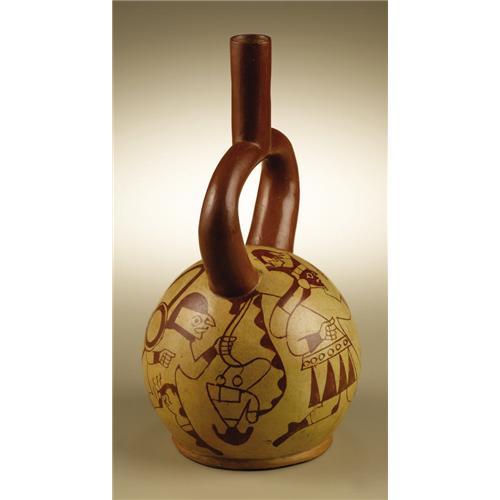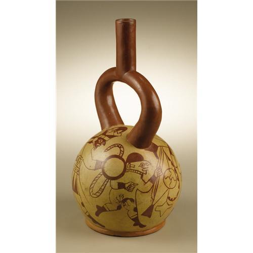 <B>Stirrup-spout Vessel with Warriors and Prisoners</B></I><BR>Moche<BR>A.D. 300 - 600<BR>Ceramic, red on buff<BR>Height 11 1/4 in. Diameter 6 3/4 in.<BR><BR>Two pairs of figures in fine-line painting are shown in rapid motion around this elegant fourth-stage stirrup-spout vessel. In both pairs a naked prisoner runs before an armed warrior who reins in the prisoner by a neck cord held in the left hand along with a small round war shield. Each warrior holds in his right hand a weapon with a club head on a wire-thin shaft. The warriors wear differing helmets and waist bands but similar kilts. Each prisoner carries in his left hand a "trophy" of his own stripped arms. In Moche society nakedness constituted an extreme form of humiliation of captives. The vessel is in good overall condition, with two small drill pits in the base, although the owner's records did not include laboratory reports.<BR><BR>Provenance<BR>Sotheby's, New York: sale 7902, 15 May 2003, lot 270, pp.182-183<BR><BR>