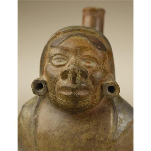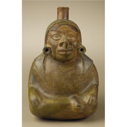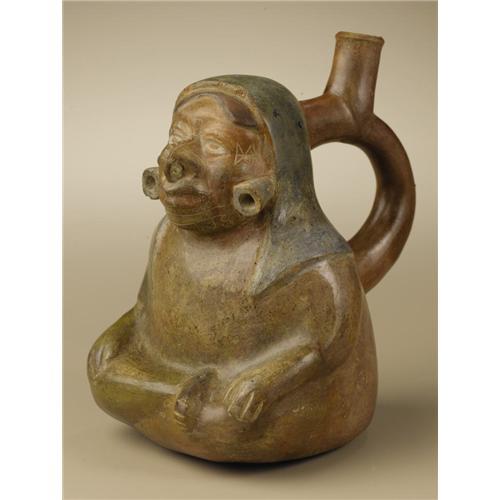 <B>Stirrup-spout Vessel: Seated Figure</B></I><BR>Moche<BR>A.D. 200 - 500<BR>Burnished ceramic<BR>Height 7 in. Width 4 7/8 in.<BR><BR>The deftly simplified but still lively figure is seated cross-legged, the right leg and foot visible along the vessel front. The hands rest on the knees. The head is covered by a simple cloth, and large slightly-flared tubular earspools frame the cheeks. Attention focuses on the expressive face, with its prominent nose and jaw area. Facial ornament has been delicately incised at the temples, down the nose, and across the chin between the ear ornaments. An incised triangle at the center lower lip, apex upward, completes the incised facial decoration. Slip application with subtle color variation further defines the modeled lips, eyes, and hair areas. The condition is good, with a small pressure crack near the proper right rear base. The vessel may have been waxed.<BR><BR>Provenance<BR>Bonhams & Butterfields, San Francisco: sale 7477E, 8 December 2003, pp.17-18, lot 3051<BR><BR>