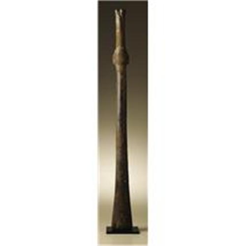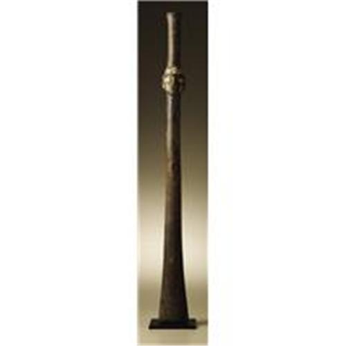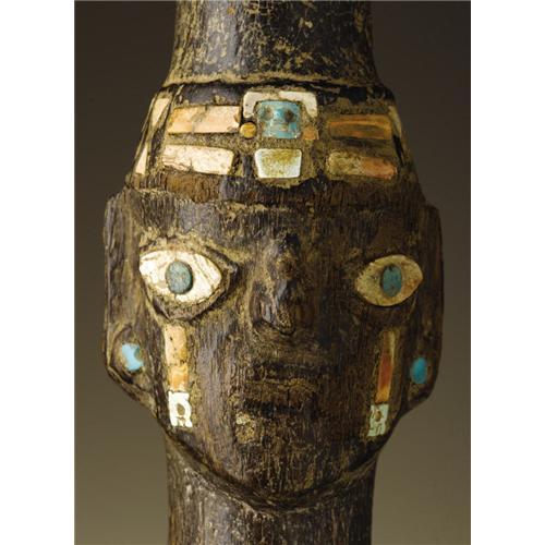 <B>Trumpet with Human Head Effigy</B></I><BR>Moche<BR>A.D. 100 - 600<BR>Wood with shell and green stone inlay<BR>Length 26 1/2 in. Diameter 2 3/8 in.<BR><BR>This ceremonial effigy trumpet, made from a heavy coarse-grained wood, has a simplified low relief human head a short distance below the mouthpiece. The eyes are inlaid with shell and greenstone, with "tear" bands descending the cheeks inlaid in spondylus shell terminating in white shell profile animal heads. Small greenstone circles serve as ear ornaments. An inlaid headband of mixed spondylus and white shell has a minute central, highly stylized mask formed of greenstone and shell, its greenstone rectangle carved with a low relief eye-nose unit. There is an overall age patination to the wood, with minor cracking midway down and some small ancient surface loss. Two triangular inlays are missing from the headband. The abraded mouth area shows evidence of having originally been inlaid.<BR><BR>Provenance<BR>Splendors of the World, Haiku, Hawaii<BR><BR>