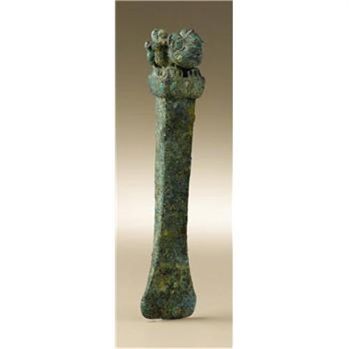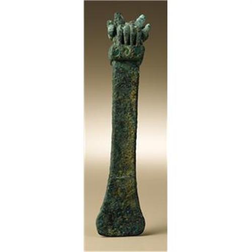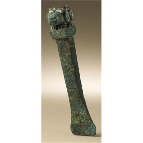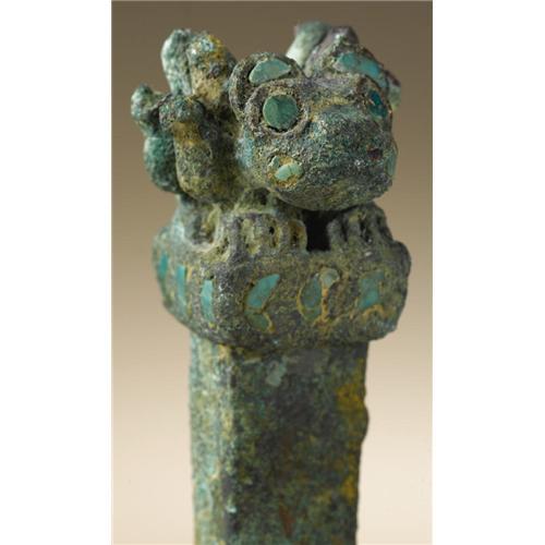 <B><I>Tumi</B></I> Topped by an Animal Effigy</B></I><BR>Moche<BR>A.D. 100 - 600<BR>Copper, turquoise or chrysacola<BR>Height 5 7/8 in. Width 1 1/4 in.<BR><BR>Miniature cast copper effigies and scenes are one of the outstanding accomplishments of Moche artist-craftsmen. One favored context for these castings was at the top of small-sized examples of the type of chopping knife known as a <I>tumi.</B></I> In this one an unexpected conjunction of animal and activity occurs: a square-headed, snarling feline is show performing the burden-carrying function of a llama: eight minute sealed vessels are stacked, four to a side, on the animal's back. Green stone inlays (either turquoise or chrysacola) pick up details of the head and form a decorative band around the rectangular base on which the animal stands. A somewhat crusty green age patination covers the entire surface.<BR><BR>Provenance<BR>Splendors of the World, Haiku, Hawaii<BR><BR>