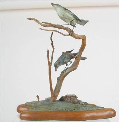 Mocking birds mounted in branches with a Midwest box turtle on blue-green driftwood which is glued a oval wooden base. (decoy)