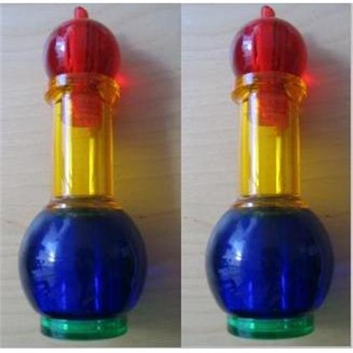 1960?s style colorful oil and vinegar holders made from translucent Lucite in red, yellow, blue and green. 8? tall, 3? wide at base 65