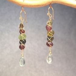 Metal: GoldWoven tourmaline rounds with moss aquamarine, about 2".Available in either 14K gold-filled, rose gold-filled, or sterling silver. All jewelry is entirely handmade in our studio in New York.