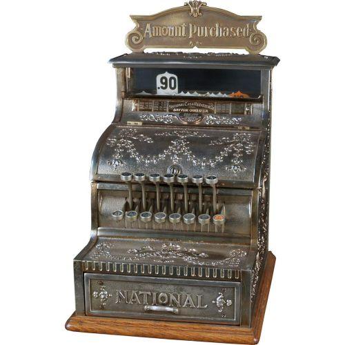 Model 130 Bohemian Candy Store National Cash Register restored in nickle finish w top sign