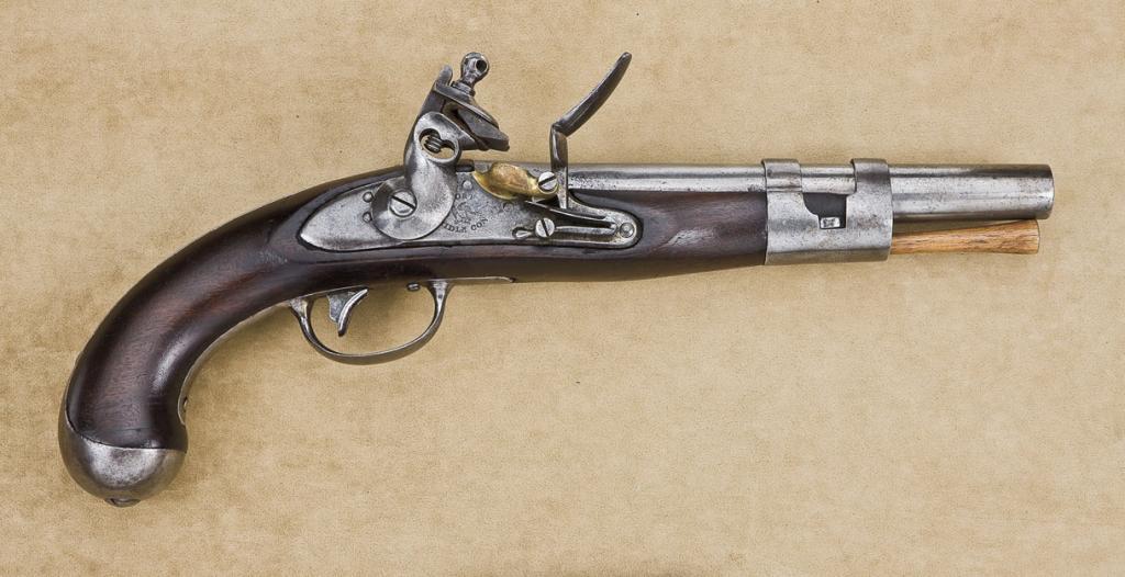 Model 1813 US Flintlock Army and Navy Martial single shot pistol, .69 cal., 9-1/16” barrel, no sights, wood stock, swelled tip wood ramrod. This gun is in overall good to very good condition showing a light grey patina over metal surfaces with some scattered pin prick pitting and erosion areas, particularly around the breech of the barrel, strong “P” and “US” proofs on left side of barrel at breech and “H.H.P.” inspector’s mark on the right side of the breech above the touch hole; the lock plate marking of “S. North” and” Midln Con” with spread eagle is approx. 95% visible; the iron mounts are very good with just some light pin prick pitting; the stock is in overall very good condition with an old crack at the wrist on the left side and an almost imperceptible repair to an area around the left side lock plate retainer. Strong demand by collectors for this Model as less than 1,650 were made between 1813 and 1815. From the Richard Wolfe Collection. Est.: $1,500-$3,000.