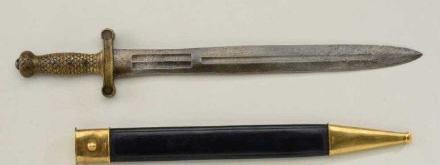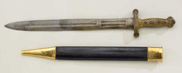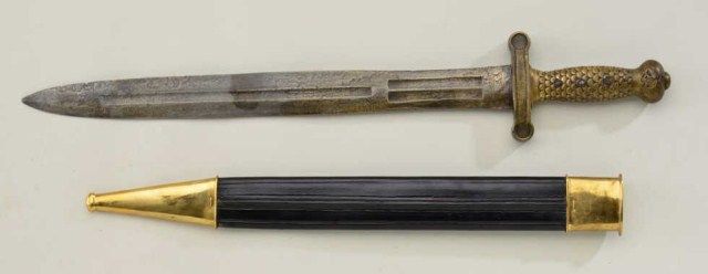 Model 1833 Ames Artillery sword with reproduction scabbard in fair to good condition. The blade shows light to slightly heavy scattered pitting and erosion. The eagle and Ames marking mostly visible butdate and inspections not visible on reverse. The hilt shows good patina and number 8 on cross guard in punch dot style marking. Est.; $300-$600